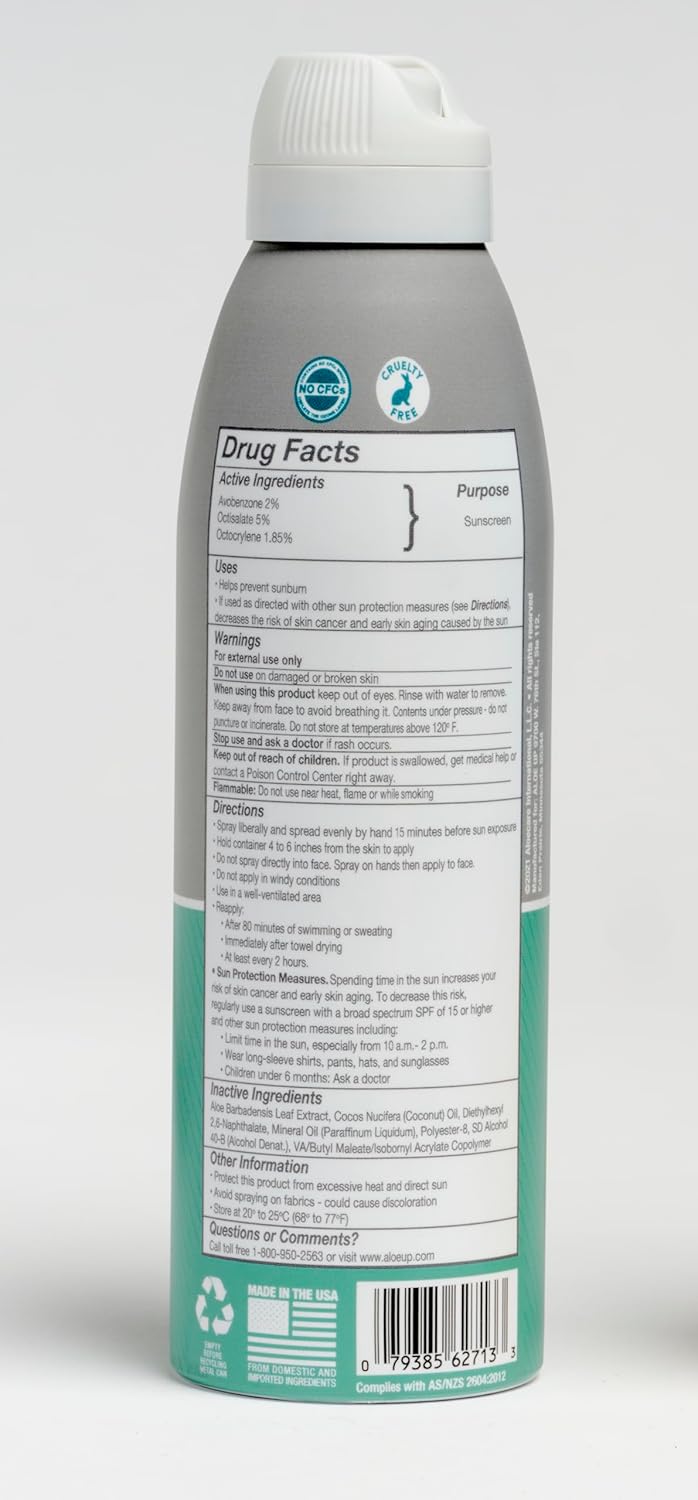 Aloe Up Sport Continuous Spray Sunscreen SPF 15 - Broad Spectrum UVA/UVB Sunscreen Protector for Face and Body - With Aloe Vera Gel - Fast Absorbing Sheer Formula - Reef Safe - Fragrance-Free - 6 Oz