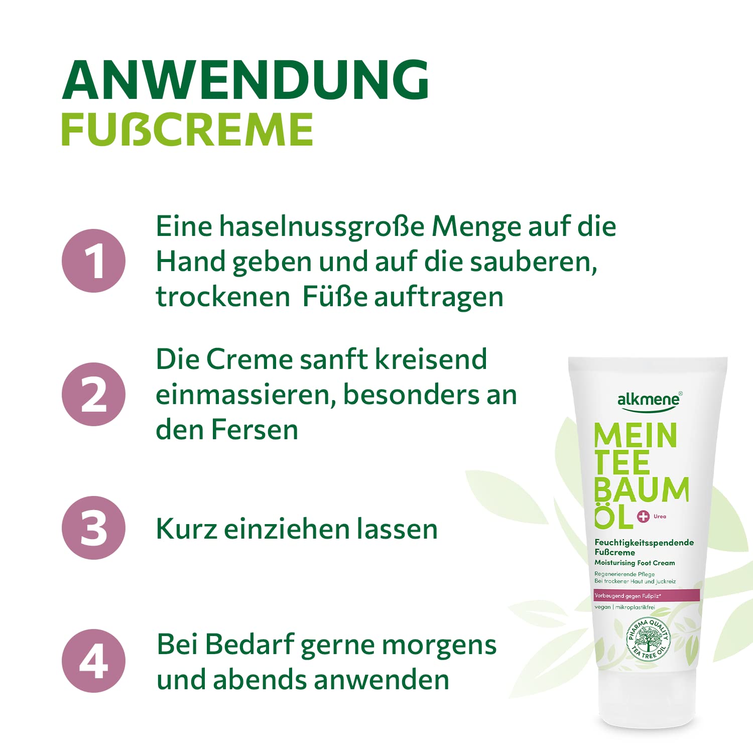 - Deeply Hydrating - Walk in pampered comfort with Alkmene Tea Tree Oil Foot Cream! Our feet moisturizer is rich in tea tree essential oil, panthenol, and shea butter. Together, they help soothe and moisturize dry, chapped skin, ensuring lasting freshness and a natural silky foot.