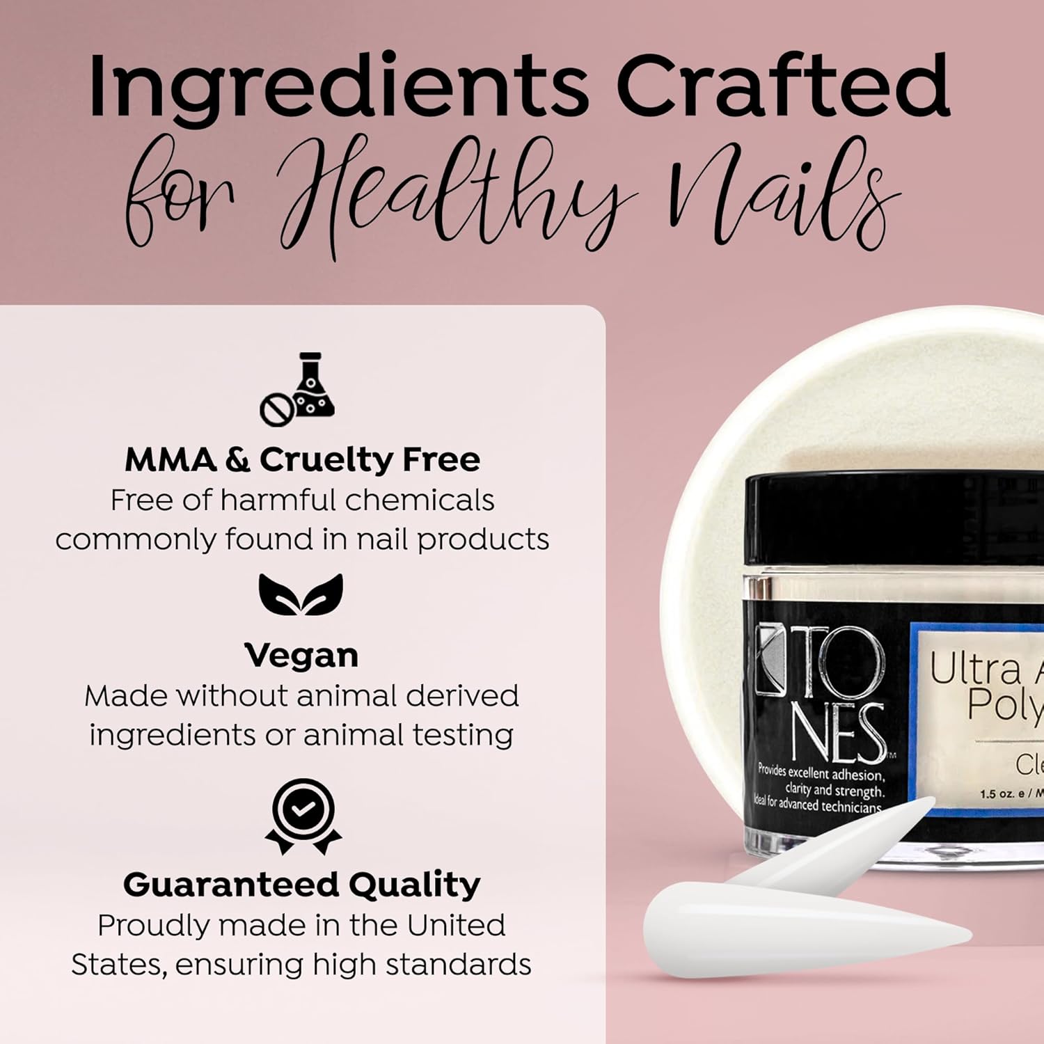 - THE TONES PROMISE: MADE IN THE USA: Trust in a brand that cares. Tones is a family-owned, women-run business proudly crafting professional-grade nail supplies in the USA. We are committed to ethical practices and premium, cruelty-free ingredients, so you can purchase with confidence.
