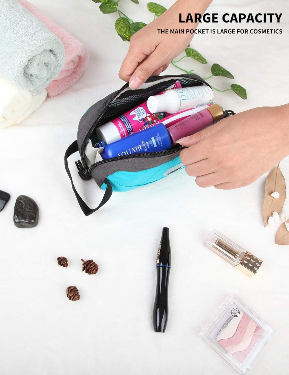 - LOTS OF POCKETS: In order to make things well organized, we designed of lots pockets for partition articles. Main compartment is large enough for bottles. In one side, a center pouch opens with a webbed waterproof zipper pouch. And in another side has been divided into 2 elastic mesh pouches. Also there is one zipper pouch for keeping small items outside in back of the pouch.