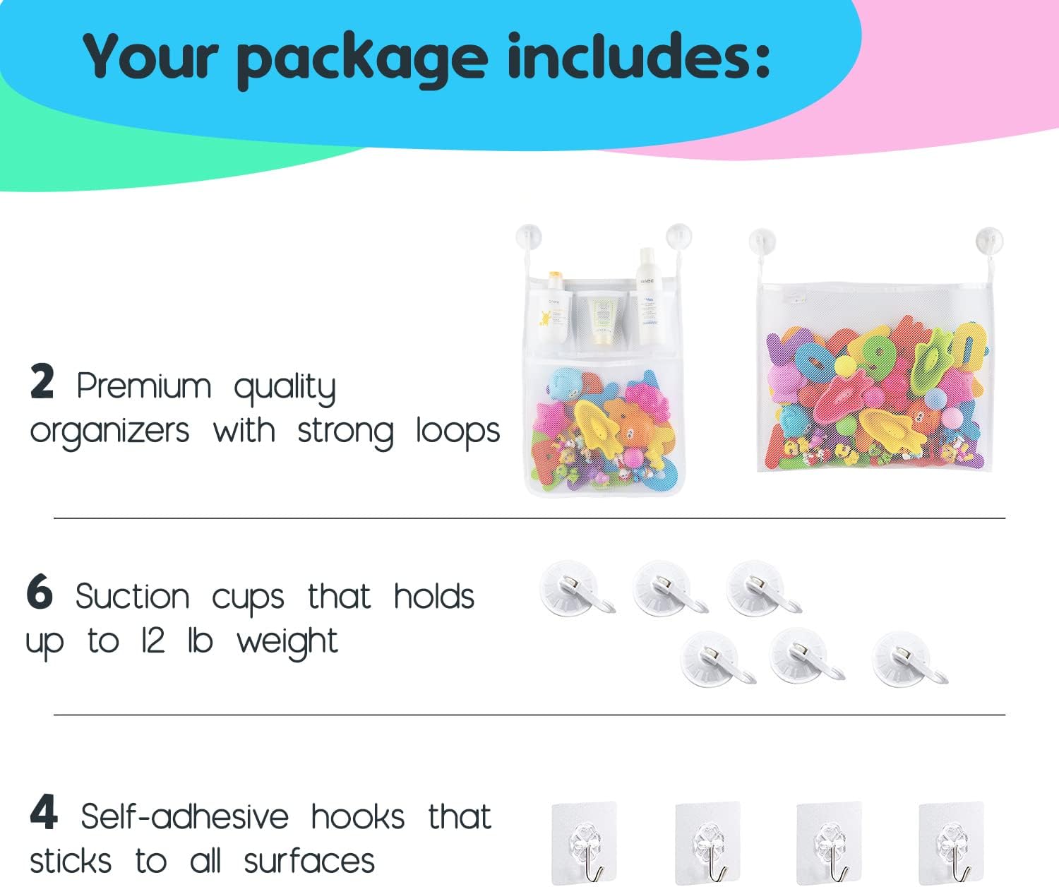2 x Mesh Bath Toy Organizer + 8 Ultra Strong Hooks – The Perfect Bathtub Toy Holder & Bathroom or Shower Caddy – These Multi-use Net Bags Make Baby Bath Toy Storage Easy – For Kids & Toddlers