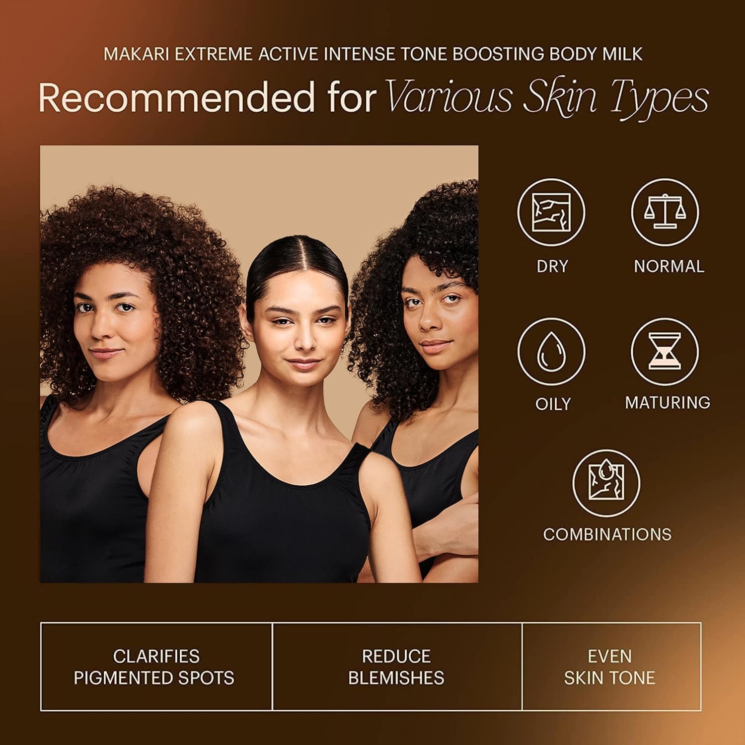 - BRIGHTENS SKIN TONE: Makari Extreme Active Intense Carrot & Argan Oil Body Milk contains moisturizing botanicals that help balance your skin tone. These botanicals work together to encourage flawless, smooth, silky skin.