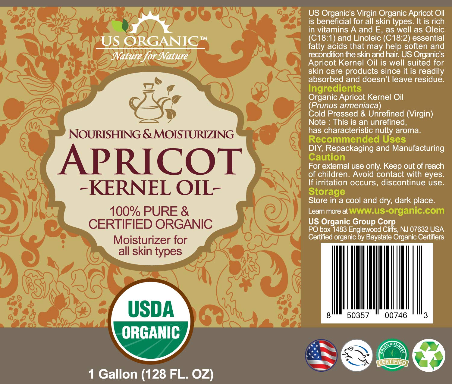 US Organic Apricot Kernel Oil, USDA Certified Organic,100% Pure & Natural, Cold Pressed Virgin, Unrefined, Size for DIY and small manufacturers (128 oz (1 Gallon))