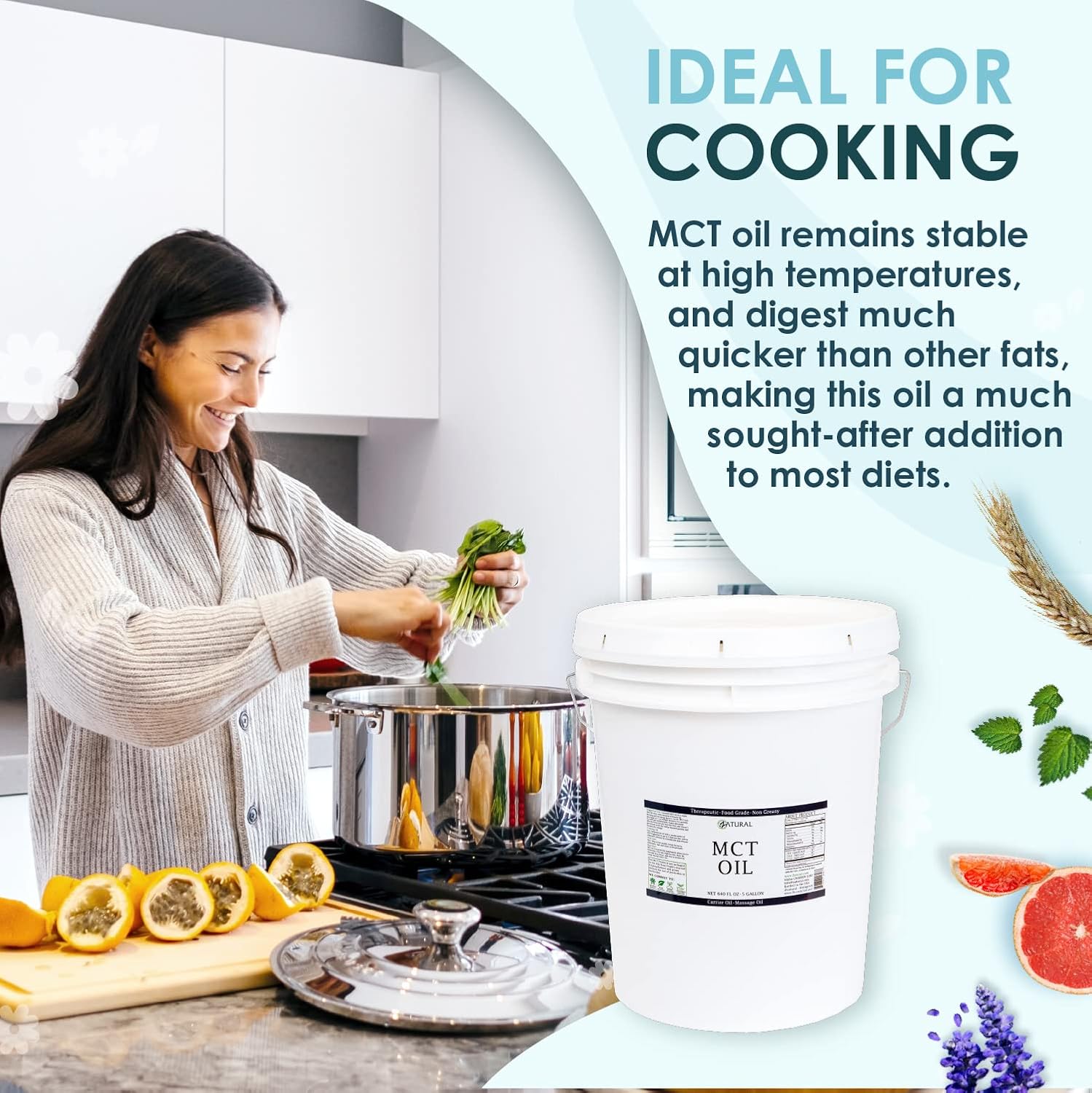 - FOR COOKING: MCT fats digest more quickly than other fats, making this oil a much sought-after addition to most diets. MCT oil is an ideal cooking oil because it remains stable at high temperatures.