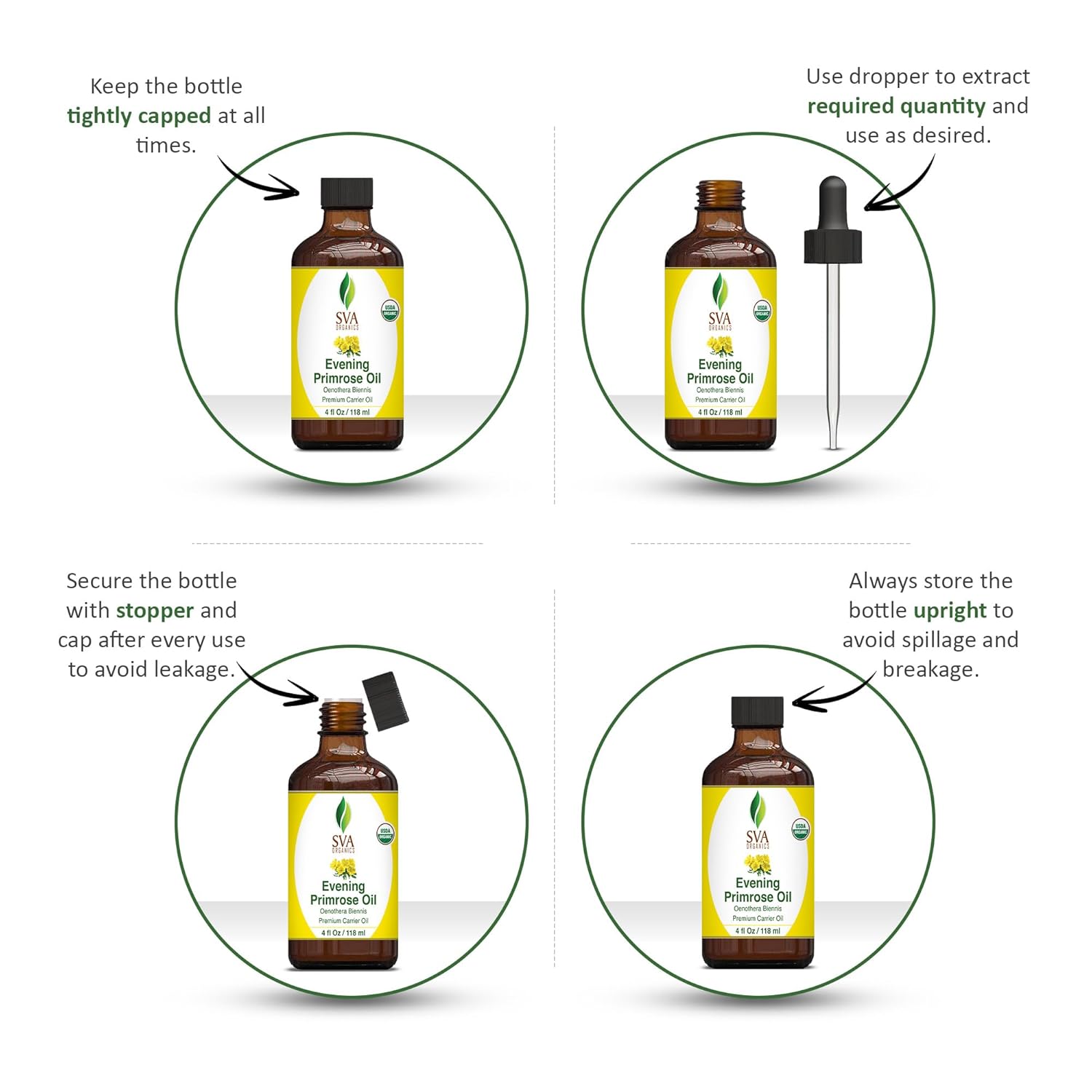 - How To Use: SVA Evening Primrose Oil is easy to use. Put a few drops on your palm and gently massage your body and scalp for a few minutes. Leave it for 30 minutes and wash off with a gentle cleanser. You may use Evening Primrose Organic oil for your face and hair and leave the oil overnight for better results.