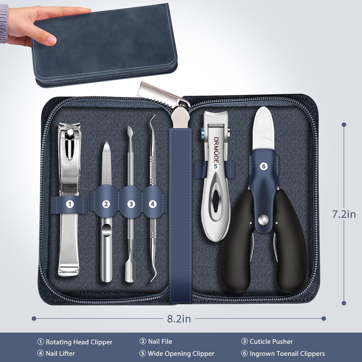 - [What You Will Get]: DRMODE 6-in-1 heavy duty nail clippers set includes 1× Podiatrist Toenail Clippers, 1× Wide Opening Nail Clippers for men, 1× 360 Degree Rotary Nail Clipper, 1× nail file, 1× nail cuticle pusher, 1× nail lifter, 1× leather case. They are ideal tool for thick nails, ingrown nails, big toenails and side nails. Toenail clippers are great for seniors, men and women.