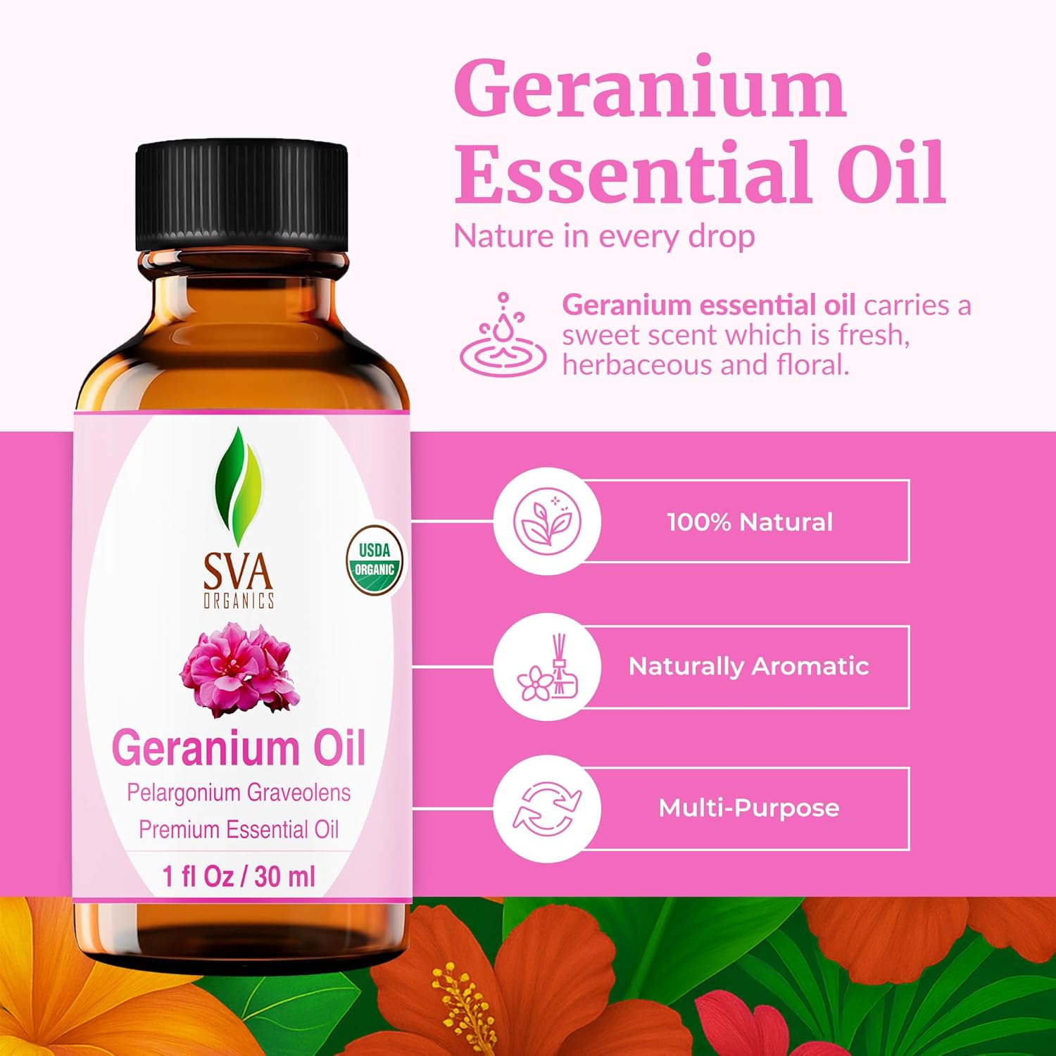 - Premium Quality Organic Geranium Essential Oil: SVA Geranium Essential Oil 1oz is an essential oil and is obtained by steam distillation of Pelargonium graveolens flowers. Our Geranium oil is free of preservatives and comes with a dropper for easy application. It is not tested on Animals. We care for you