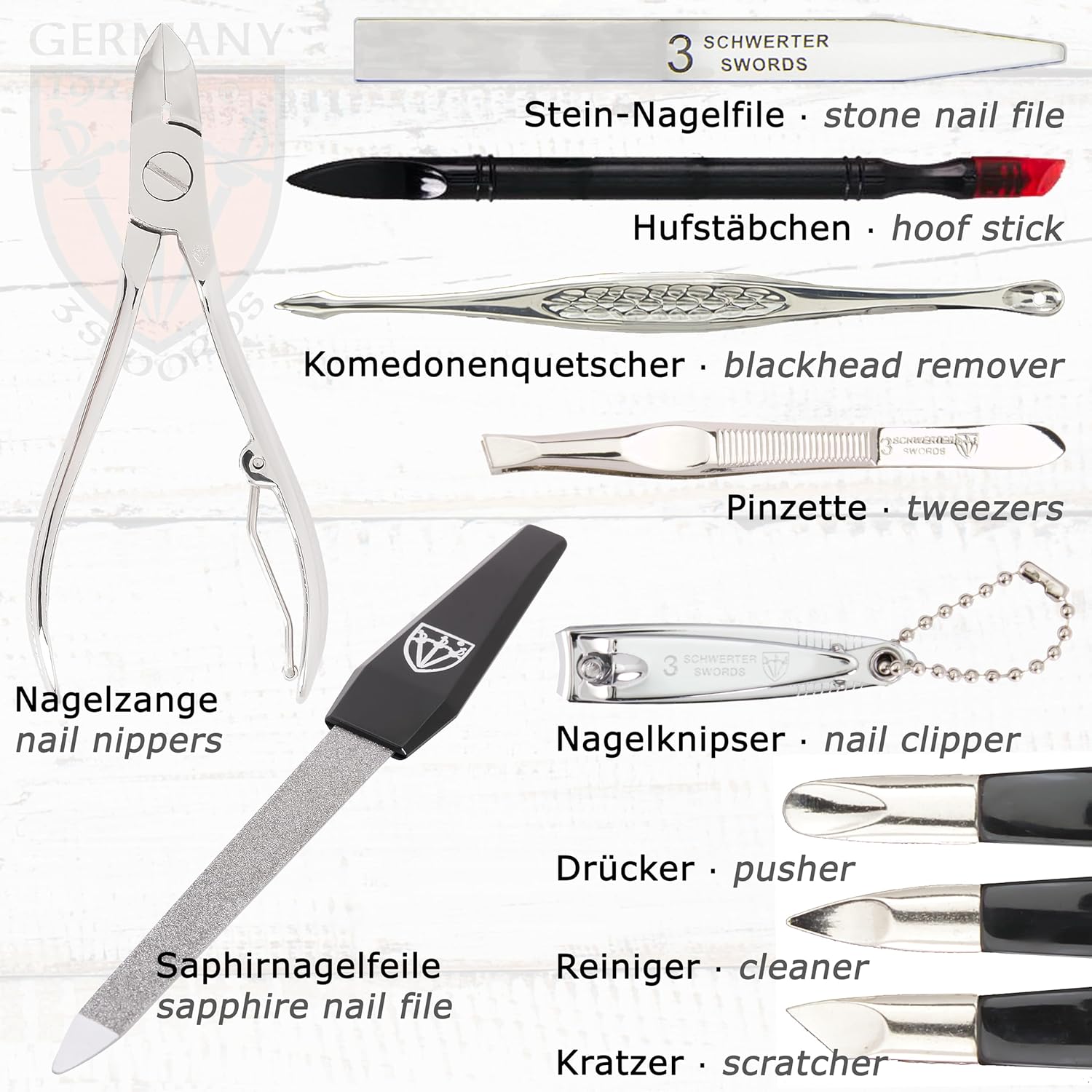 - NAIL CARE KIT from 3 Swords Germany with professional manicure and pedicure tools. Our sets for home and travel use convince trough highest levels of quality, modern design, durability and German engineering combined with a first class customer service.