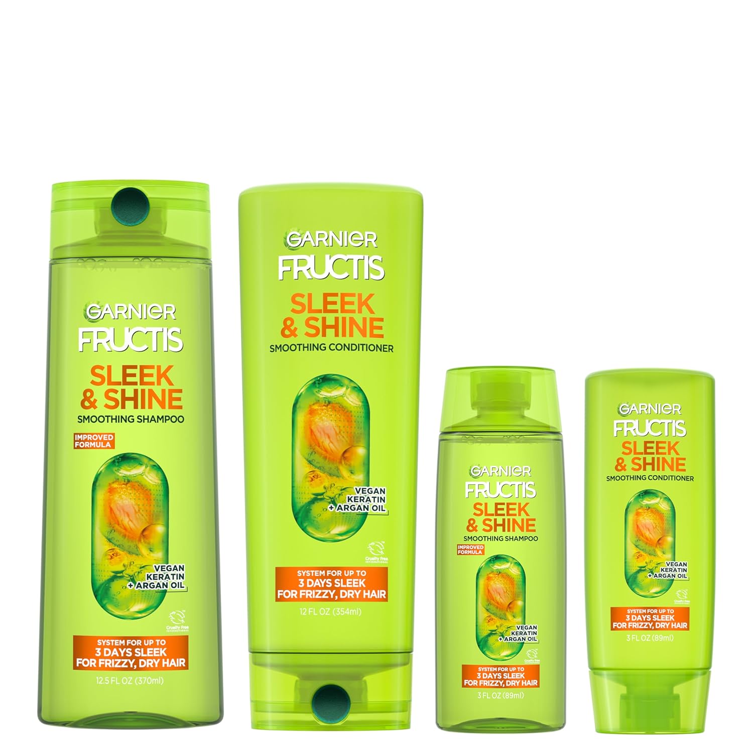 Garnier Fructis Sleek & Shine Full + Travel Size Shampoo (12.5 & 3 Fl Oz) + Conditioner (12 & 3 Fl Oz) Set for Frizzy, Dry Hair, Plant Keratin + Argan Oil (4 Items), 1 Kit (Packaging May Vary)