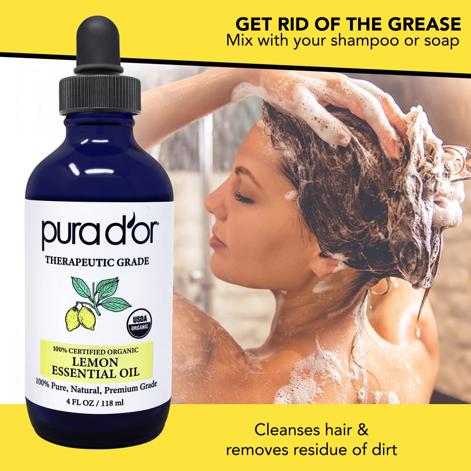 - GET RID OF THE GREASE: Greasy hair or hands, Lemon Essential Oil can work its magic with your shampoo or soap. It cleanses hair and removes the residue of dirt to stop the buildup that causes grease.