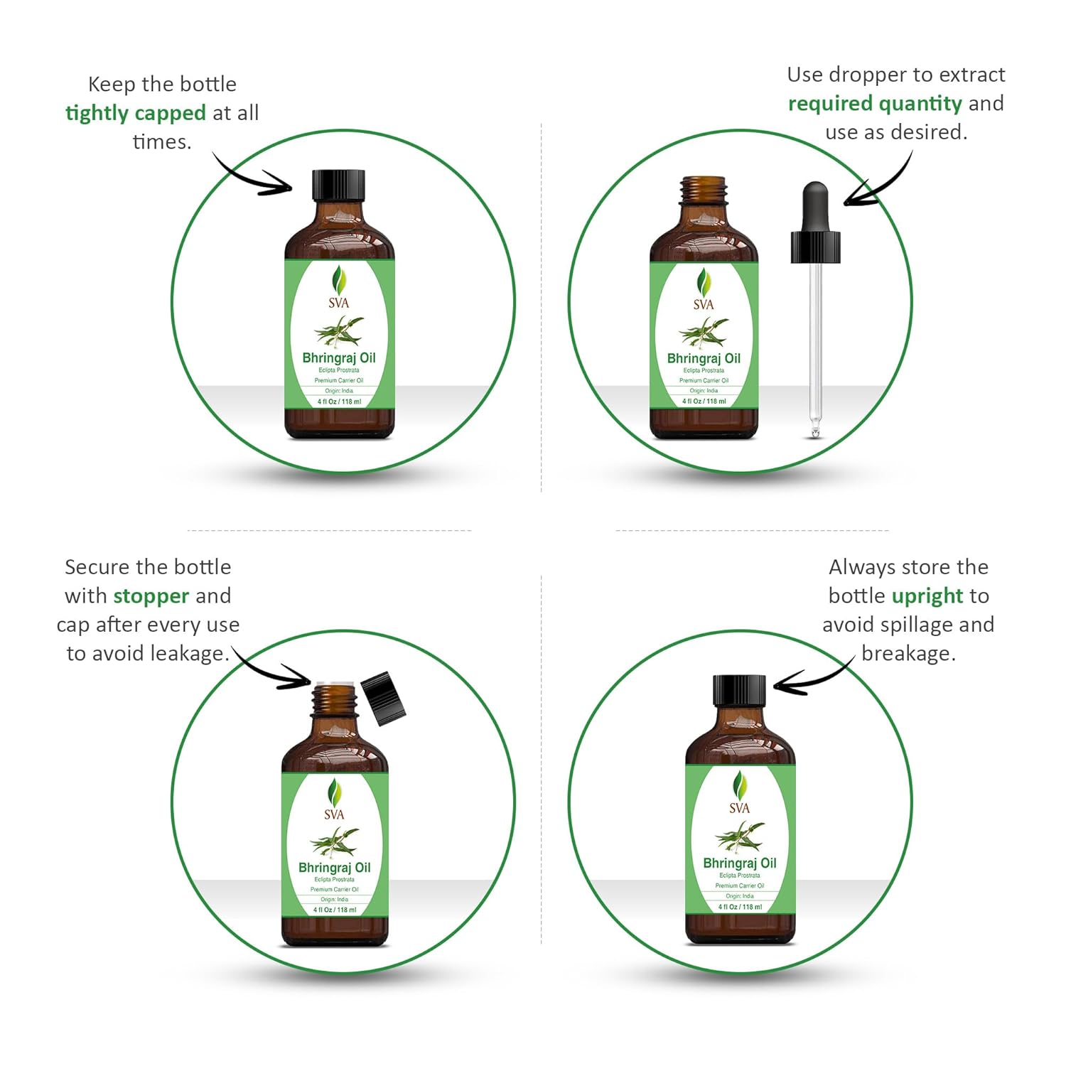 - Premium Quality Carrier Oil: SVA Bhringraj Oil is obtained by cold-pressed extraction of Eclipta Prostrata leaves. Our Bhringraj oil is free of preservatives and comes with a dropper for easy application. It is not tested on Animals. We care for you!