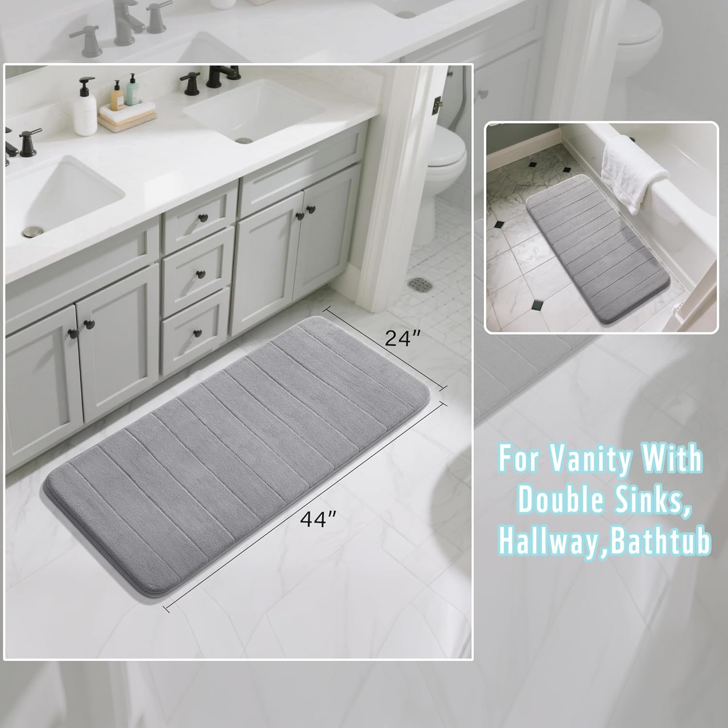 - 【Every Bathroom Hero: Custom Fit for All Spaces】This versatile product is not limited to one spot! Whether you need a non-slip guard for your bathtub or shower, a mat beside toilet, or a bathroom decor, it fits preeminently. The smaller sizes suitable for single-sink vanities, while the larger cover two-sink vanities, bathroom hallways, and even serve as reliable companions in the kitchen