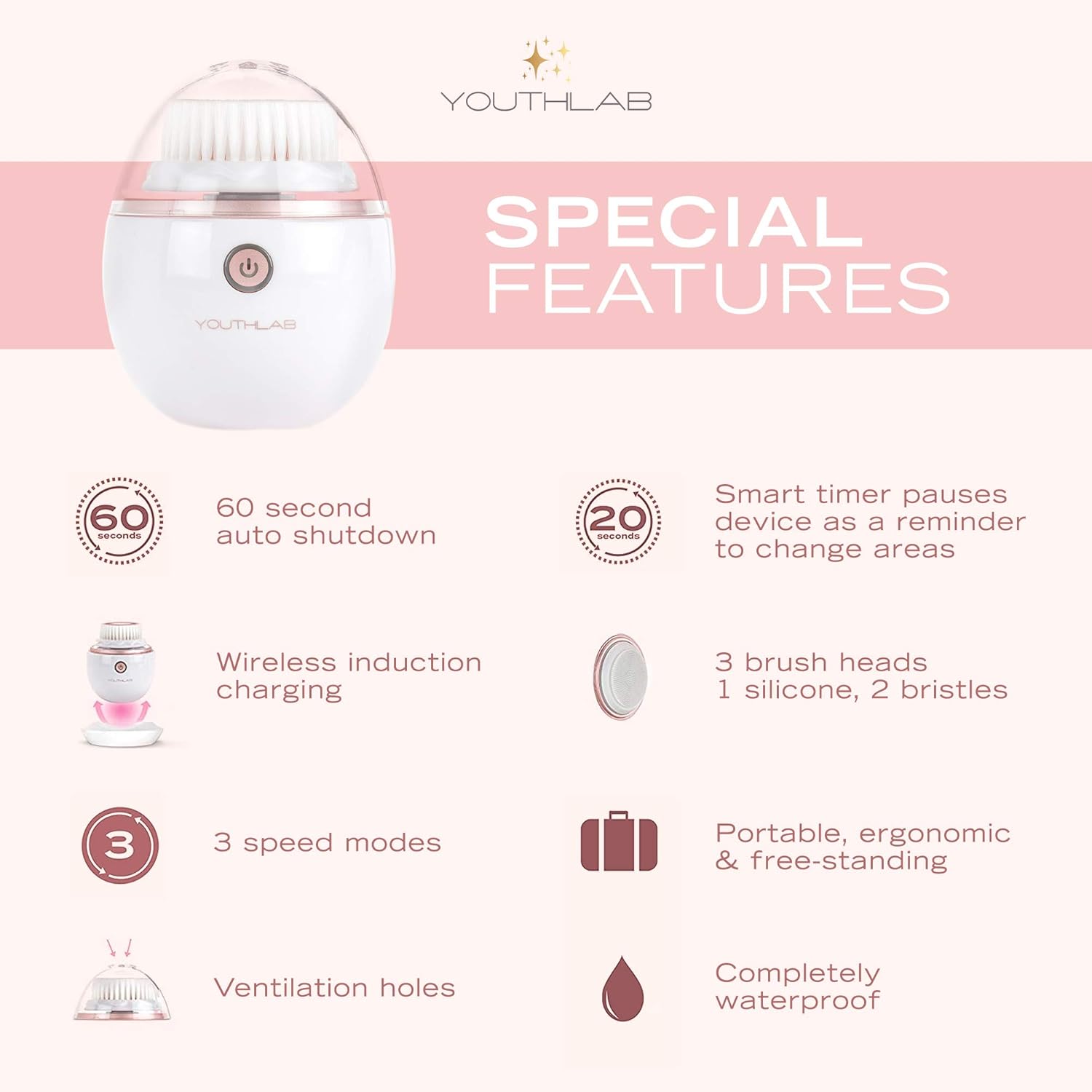 YouthLab Pure Radiance, Vibrating Facial Cleansing Brush, Electric, 3 Modes, 3 Brush Heads (2 Bristle,1 Silicone), Waterproof, Rechargeable, Smart Timer, Exfoliating, Massage (Rose Gold)