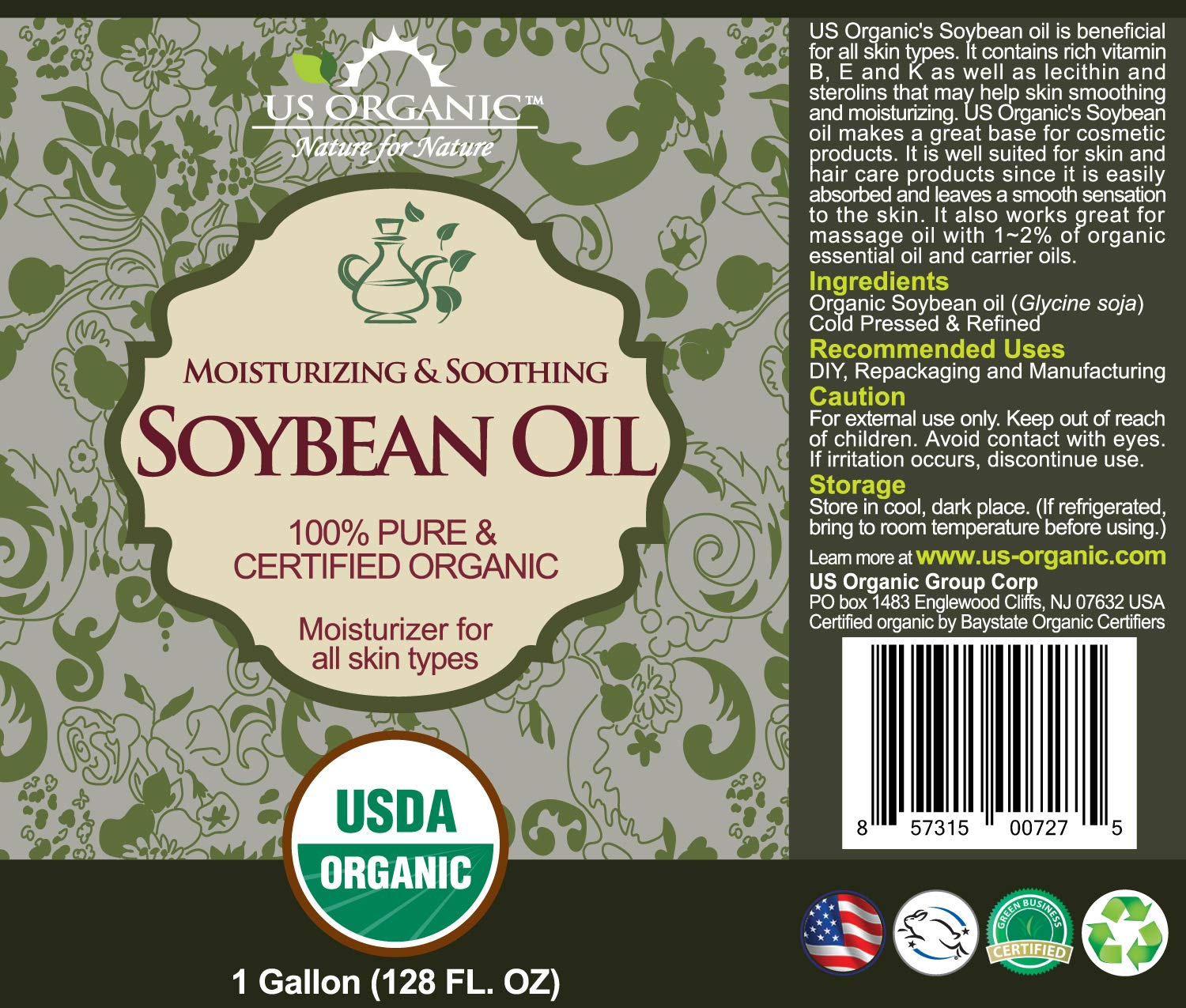 US Organic Soybean Oil bulk pack, USDA Certified Organic,100% Pure & Natural, Cold Pressed, Non GMO, Size for DIY and small manufacturers (128 oz (1 Gallon))