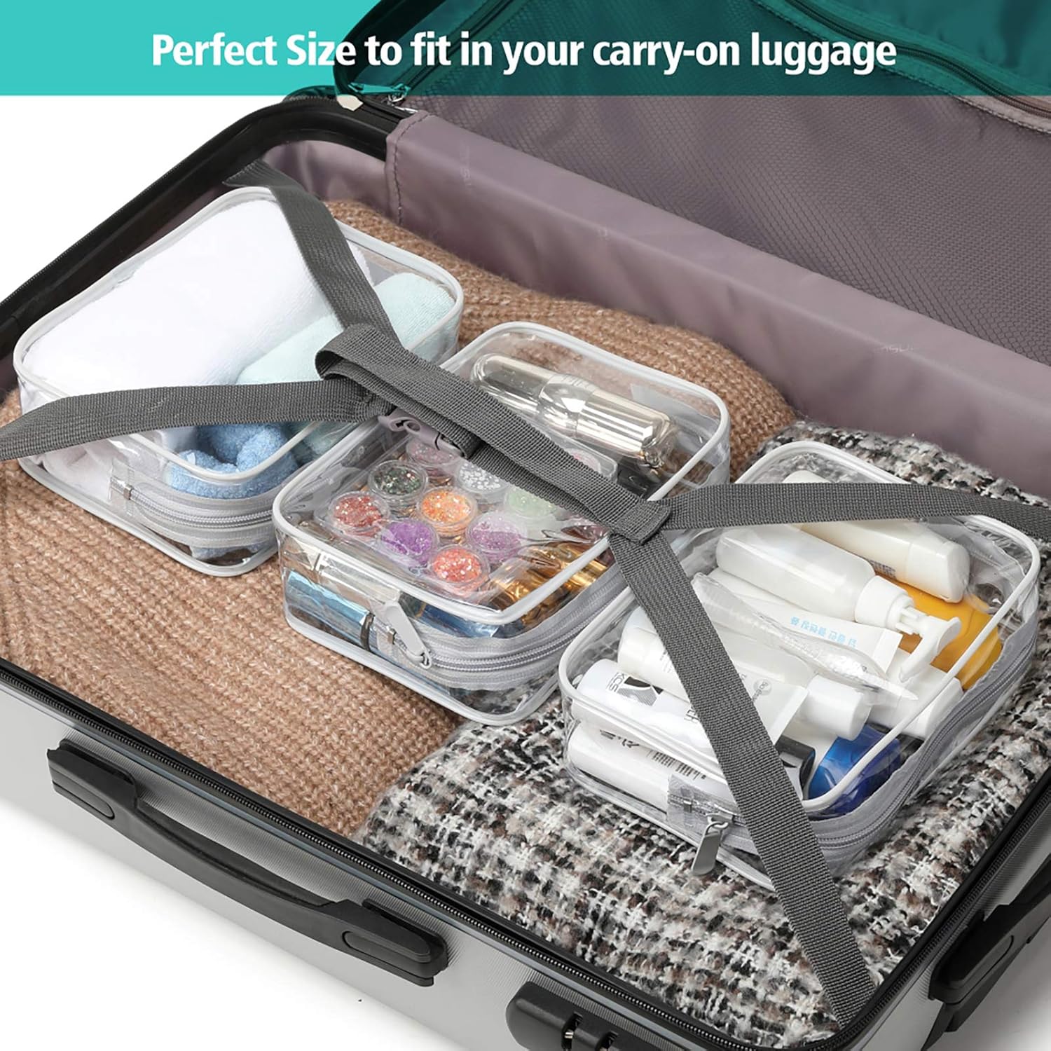 - Portable & Reusable: This quart size bag perfectly suits travel bottles, also great to store cosmetics, toiletries and small stuffs; Tips to remove the smell of the small travel toiletry bag: Please firstly wash the outside and inside of the clear makeup bag with soap and water; Please unzip the bag, then leave the bag in a well-ventilated place for a few days
