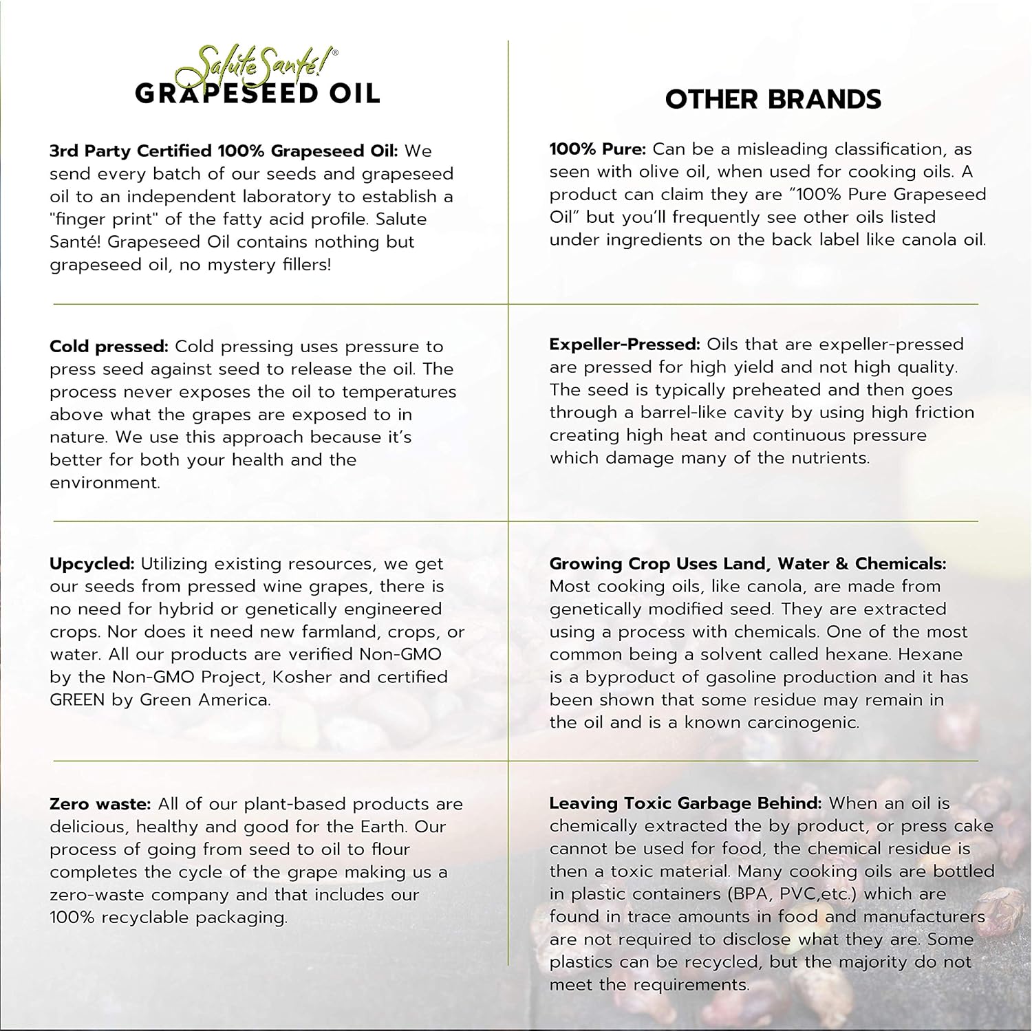 - SALUTE SANTÉ OIL: Our grapeseed oil is UPCYCLED pressed from grape seeds left over from the wine-making process. This makes it the only ZERO WASTE food!