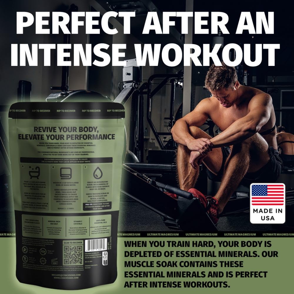 Coach Soak: Recovery Bath Soak – Rejuvenating Post Workout Natural Magnesium Flakes - 21 Minerals, Essential Oils & Dead Sea Bath Salts - Absorbs Faster Than Epsom Salts, 3lbs (Eucalyptus Tea Tree)