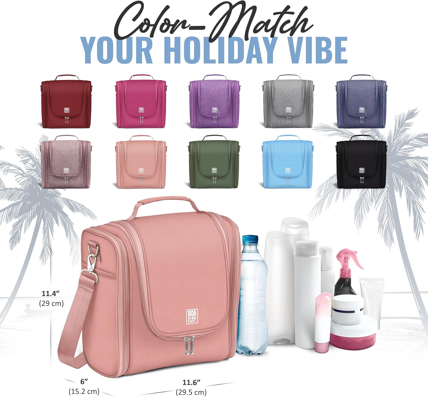 • If you want a large makeup bag, a cosmetic, or an accessories organizer, Boacay toiletry bag is for you. It is multifunctional, has metal zipper pulls, and it’s made of only high-quality materials.