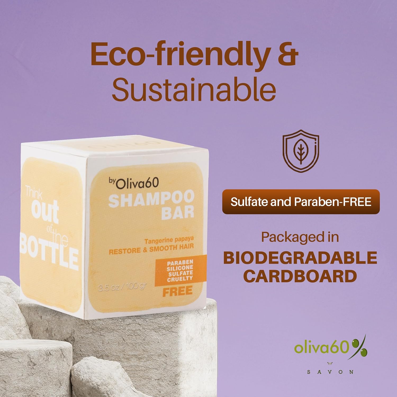 Shampoo Bar Tangerine Papaya | Olive, Argan & Macadamia Oil | Hair Care - Sulfate Free | Natural Hair Care | 3.5 oz | Hydrating & Nourishing | Extra Shine with Mandarin Essential Oil | OLIVA 60