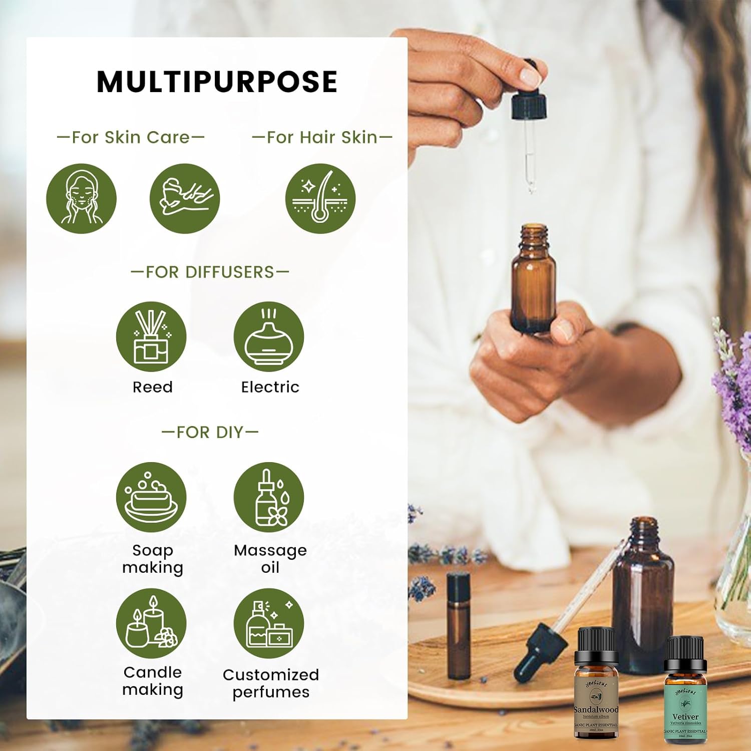 yethious Sandalwood Vetiver Essential Oil Set 100% Pure Organic Undiluted Aromatherapy Oils for Diffuser, Skin, Hair, Perfume, Soap, Candle Making 2 x 10ML