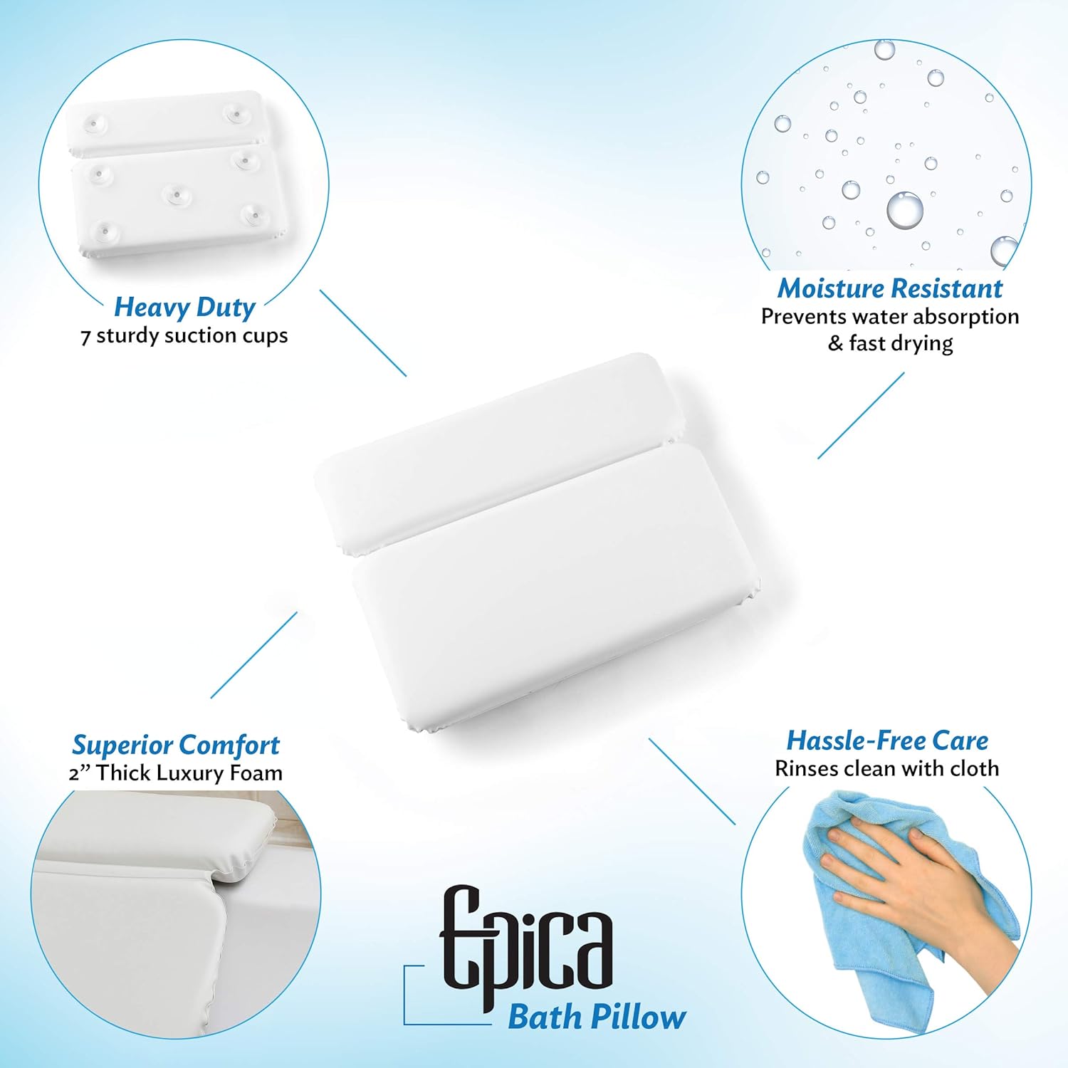 - REST EASY, IT'S EPICA!: With all the engineering and design features, you can rest easy that you're buying a wonderful bath pillow made by people who have your comfort in mind. NOTE: This pillow is not designed to grip onto textured surfaces.