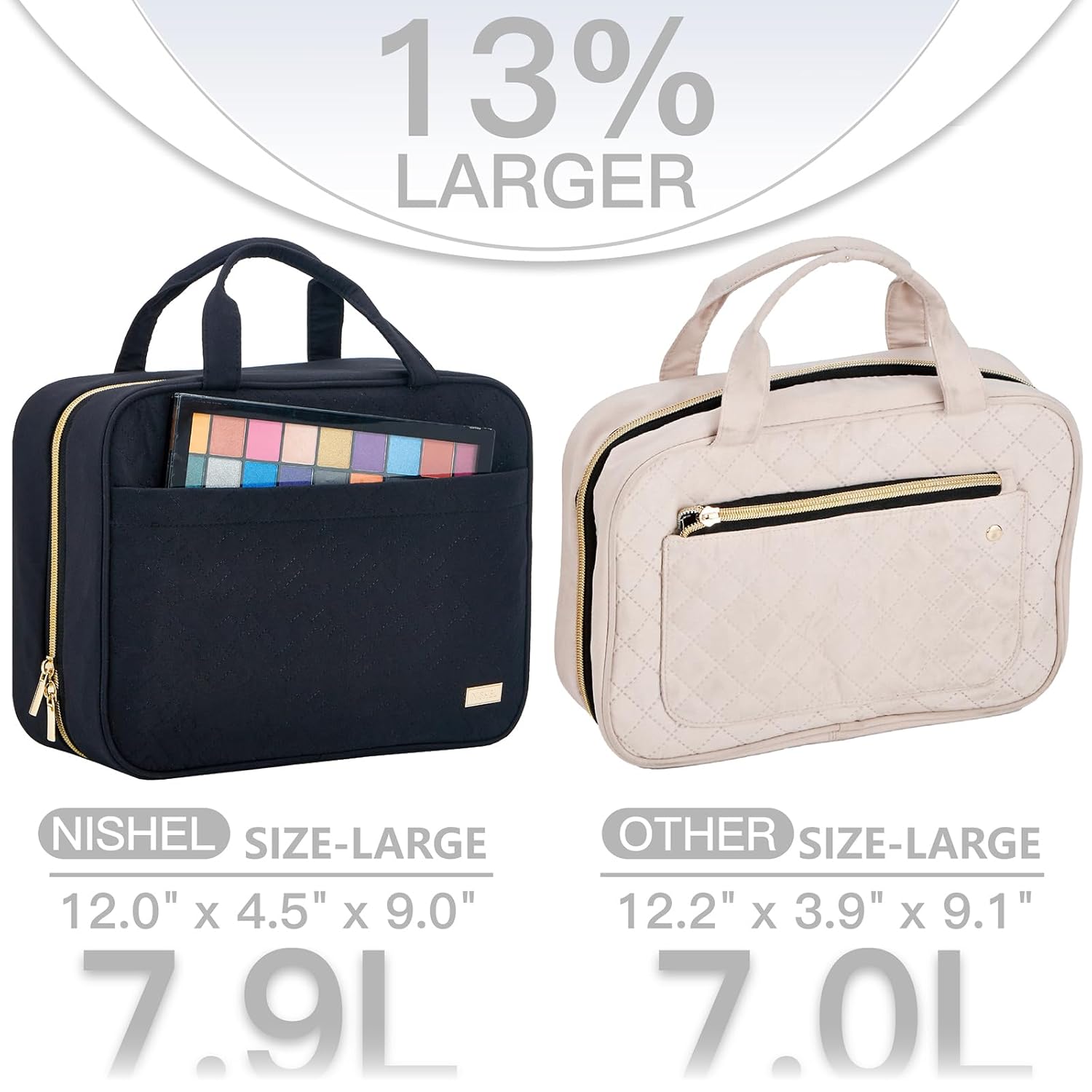 NISHEL Travel Toiletry Bag for women, Portable Hanging Organizer for Full-Sized Shampoo, Conditioner, Brushes Set, Makeup Accessories, Large Size, Black