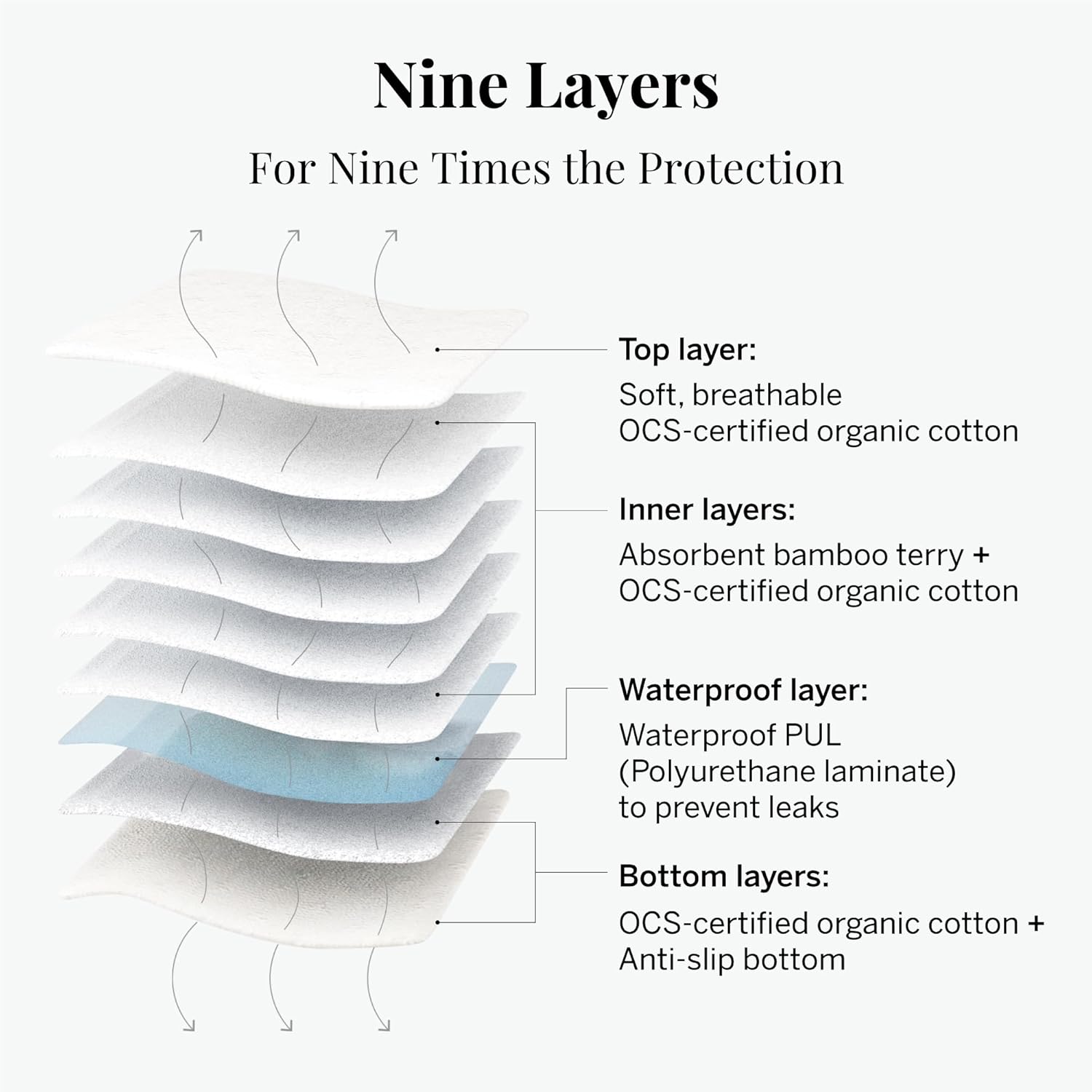 - SAFE + ORGANIC - Top layer is made with OCS certified organic cotton without the use of toxins, chlorine, pesticides, and fragrance so nothing harmful is touching your skin. No dyes, no bleach, no chemicals, ever.