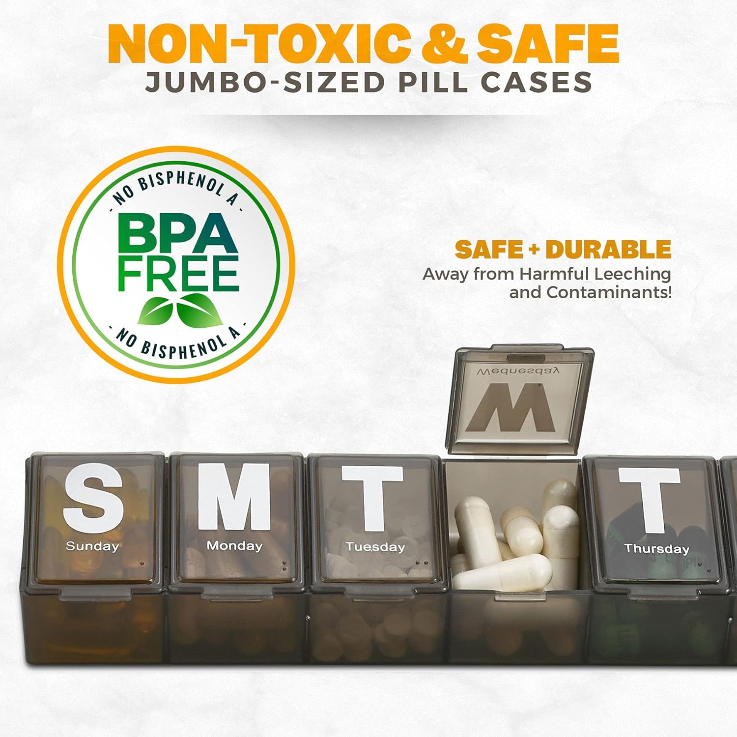 - PACK OF 2 - JUMBO-SIZED PILL CASES: If you've been looking for an extra large pill organizer, then your search is over! Imagine keeping medication neatly organized in one place and supplements out of the way and off the table. That's because our product has Extra-large compartments which means that you can fit about 20 assorted pills in one compartment which means no more mess!