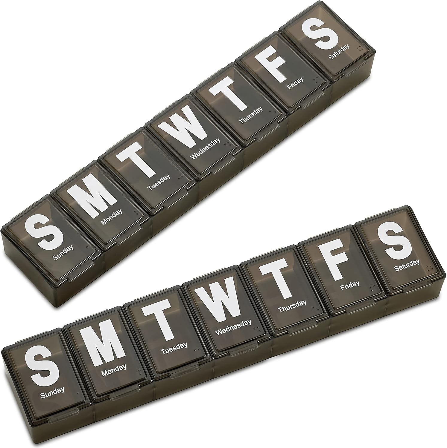 Weekly Pill Organizer - (Pack of 2) Extra Large Vitamin Container with Jumbo Easy to Read Letters, BPA Free - Daily Travel 7 Day Medication Pill Box Case, (Black)
