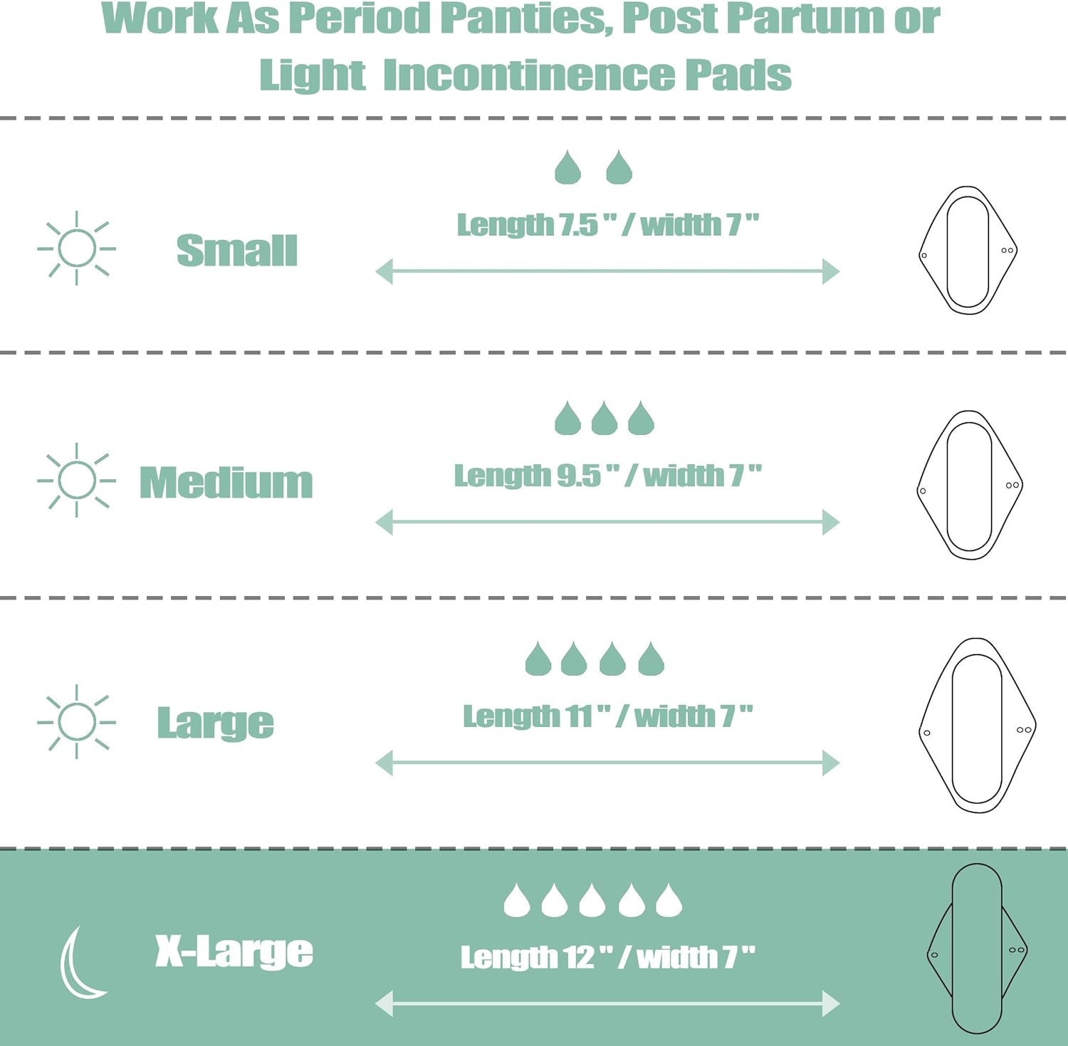 - Four Size Available, small size 8 inch long X width (including wings) 7 inch, Middle size 9.5 inch long X width 7 inch, Large size 11 inch long X 7 inch, Extra Large cloth pads, length 12 inch X width 8 inch. We recommend 6-12 small/medium cloth menstrual pads and 1-3 large heavy flow mama cloth pads