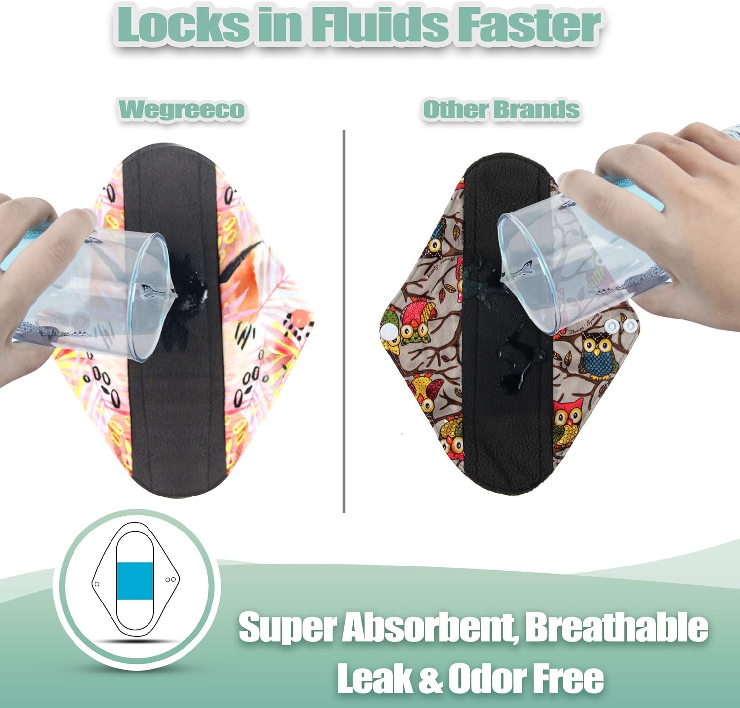 wegreeco Reusable Menstrual Pads - Reusable Sanitary Pads | Reusable Panty Liners | Soft Cloth Menstrual Pads - 6 Pack with 1 Cloth Mini Wet Bag (Large, Leaves