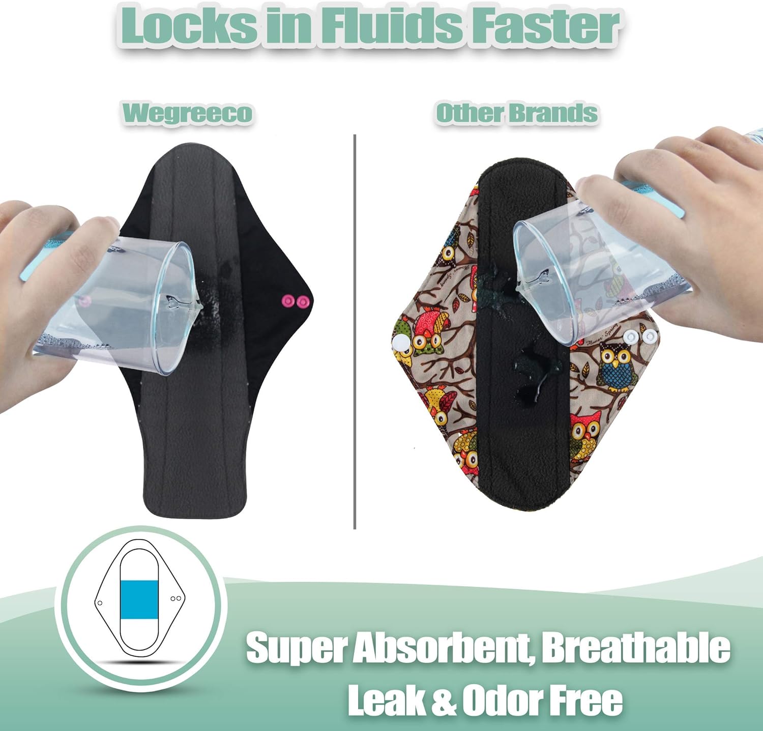 wegreeco Reusable Menstrual Pads - Reusable Sanitary Pads | Reusable Panty Liners | Soft Cloth Menstrual Pads - 6 Pack with 1 Cloth Mini Wet Bag (X-Large, Black)