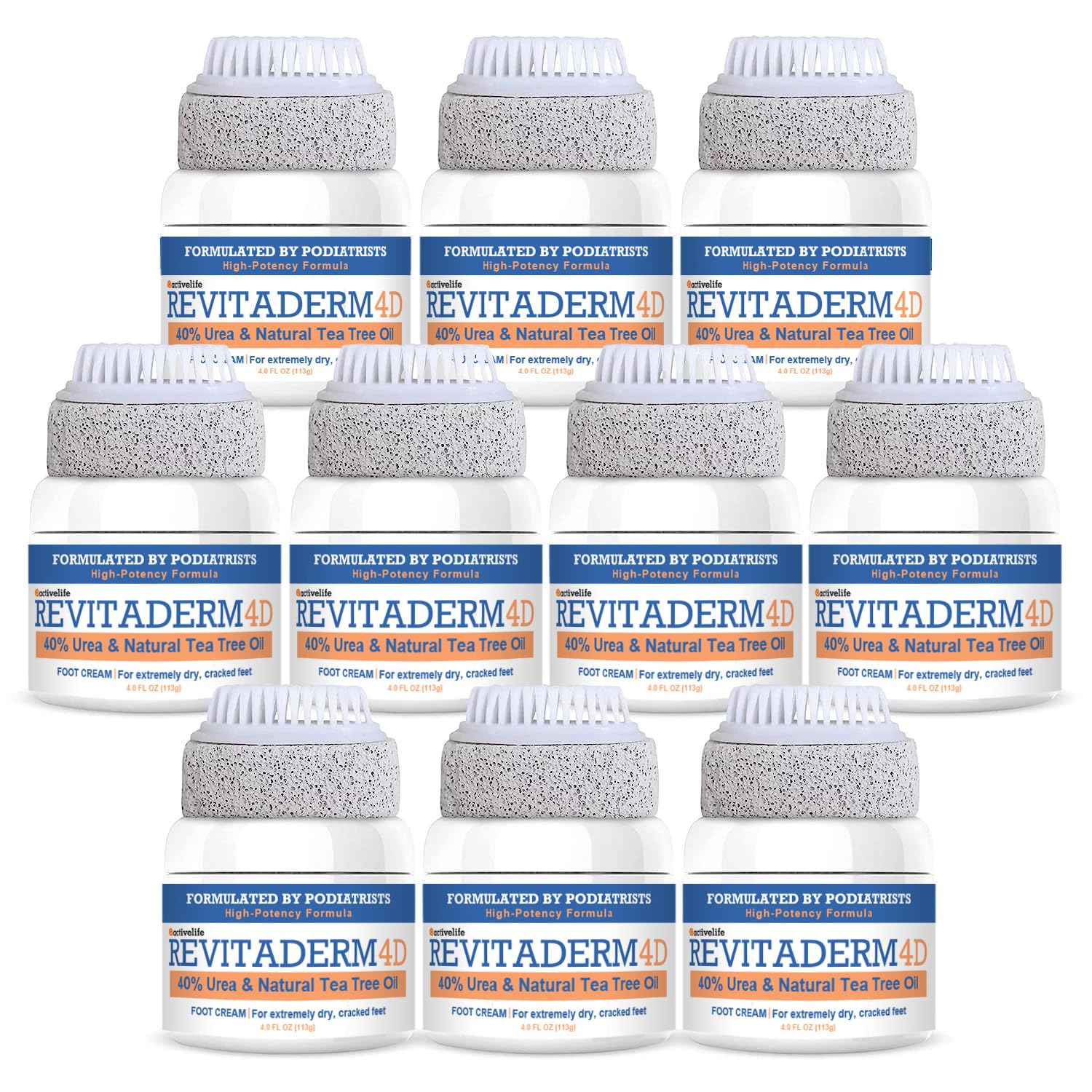 Revitaderm 4D Urea Cream 40% for Feet, Intensive Moisturizing Foot Cream for Dry, Rough, Callused Skin, Includes Free Pumice Stone and Exfoliating Brush, Fast-Absorbing, Fragrance-Free, 4oz, 10 Pack