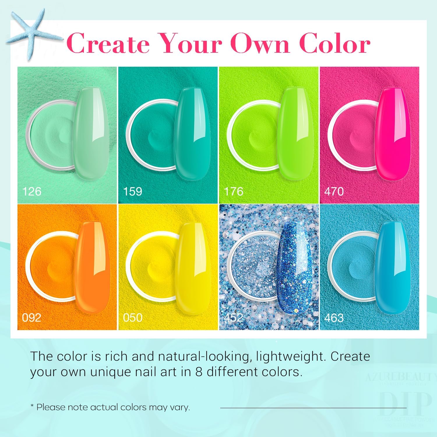 - 🧜【30 Pcs Upgraded Mermaid Starter Kit】AZUREBEAUTY 30 Pcs pastel & neon dip nails powder starter kit: 8*10g (0.35oz) color powder, 4*10ml dip powder liquid set(base coat/activator/top coat/matte top coat), 2*liquid brush replacement, 1*nail brush,1*nail file, 1*nail buffer, 1*dip powder recycling tray. 💅What's more, 10*nail sticks and 2*orangewood stickers are added in the kit for color testing as well as ease of use.💅