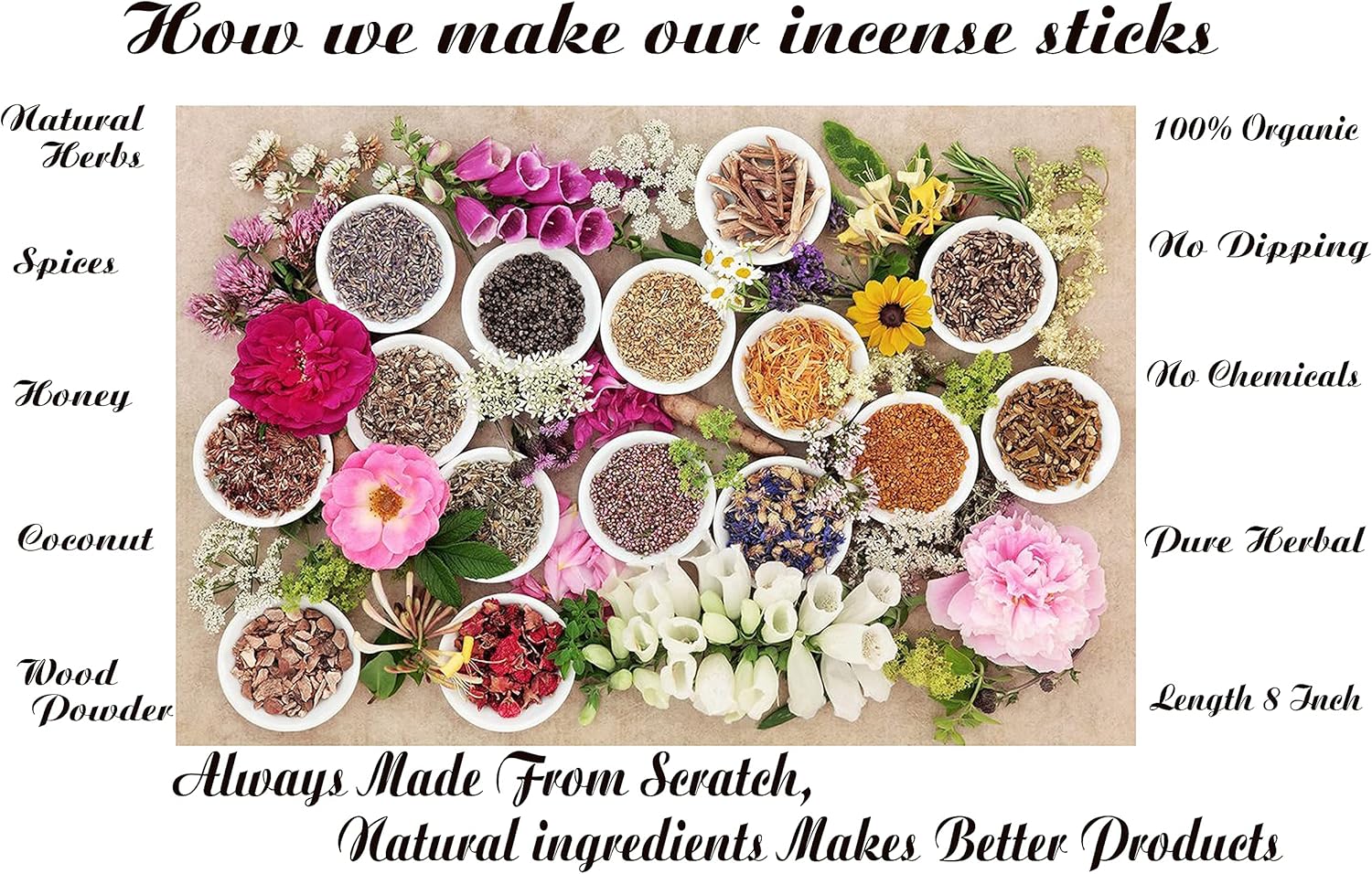 - đź’š 100% NATURAL -Natural incense Sticks completely handmade MADE FROM SCRATCH by blending natural resins, Herbs, Spices with aromatic wood powders, charred coconut powder fragrant oils and honey. No Dipping in Toxic Chemicals