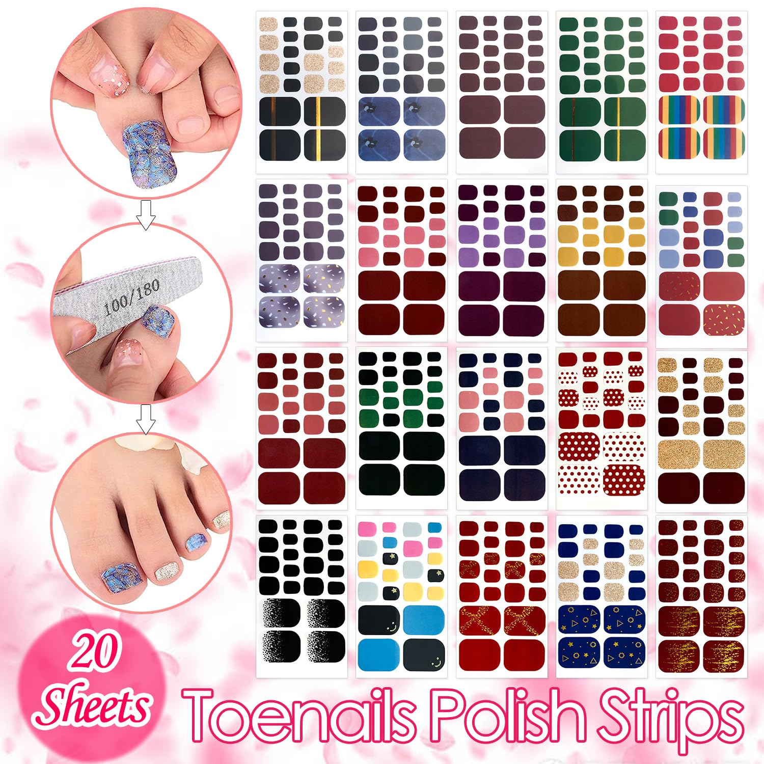 - PERFECT PACKAGE - 1Ă—20 sheets adhesive toenail art decals (glitter, gradient, rainbow) + 1pc nail file (When you receive it, you can immediately design you nail )