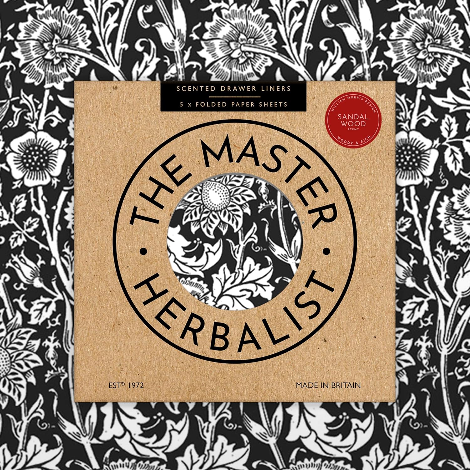- NEW & IMPROVED FRAGRANCE Formulations: SANDALWOOD Scented Drawer Liners with Essential Oils in a BLACK William Morris Design. Gift Box of 5 large paper sheets (FOLDED) Vegan Friendly, Allergen Free. Made in the UK