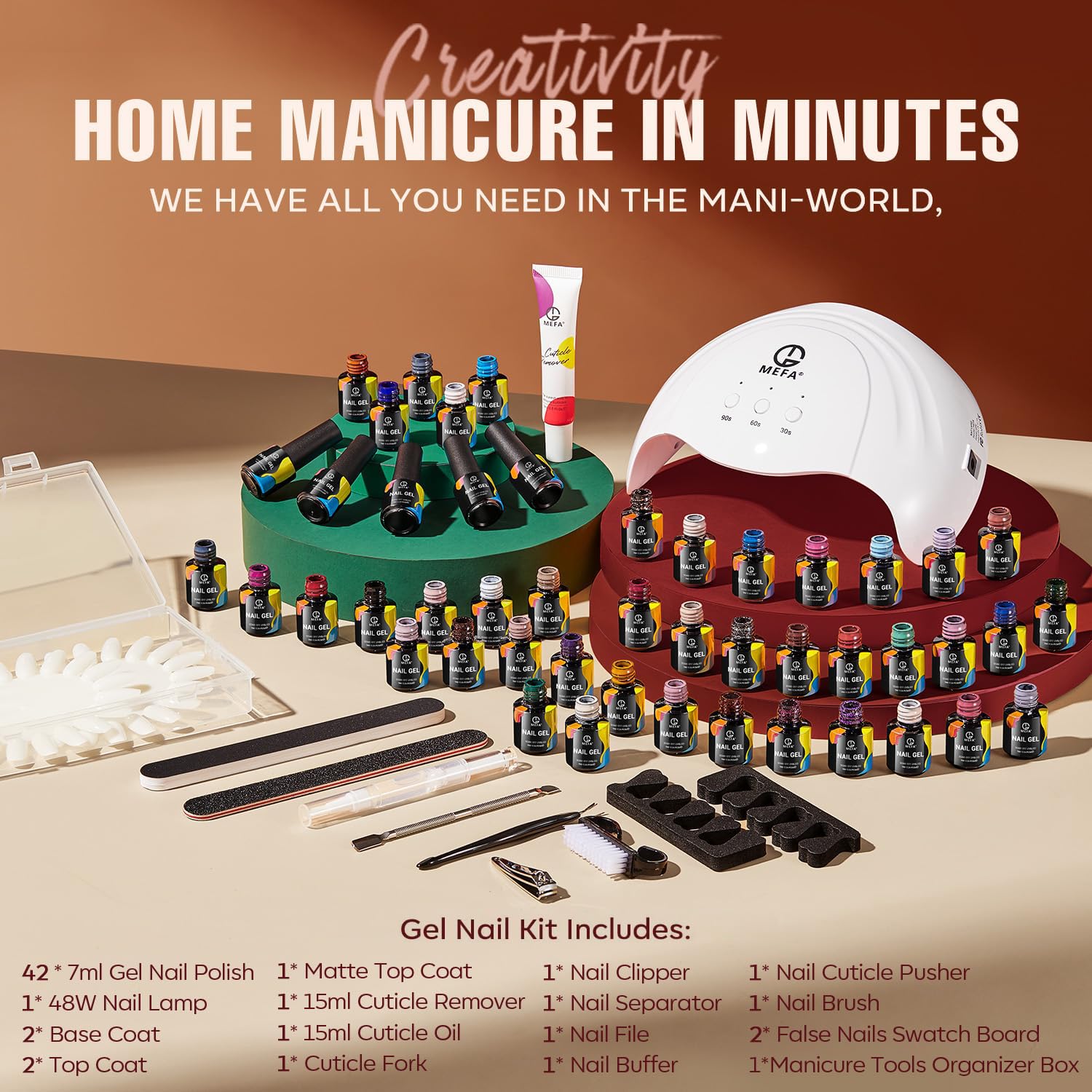 - 【60PCS ALL-IN-ONE KIT】This kit is equipped with all your salon-quality nail art needs: Gel Nail Polish 7ml*42, Quick-Drying U V LED Lamp*1, Glossy Top Coat 7 ml*2, Base Coat 7 ml*2, Matte Top Coat 7ml*1, Cuticle Oil Pen 5g*1, Instant Cuticle Remover Cream 15ml*1, False Nail Swatches*2, Manicure Tools Organzier Box*1, Nail Separators*1, Nail File*1, Nail Buffer*1, Cuticle Trimmer*1, Nail Cuticle Pusher *1, Nail Brush*1, Nail Clipper*1, high-quality gel nail kit for a cost-effective price.
