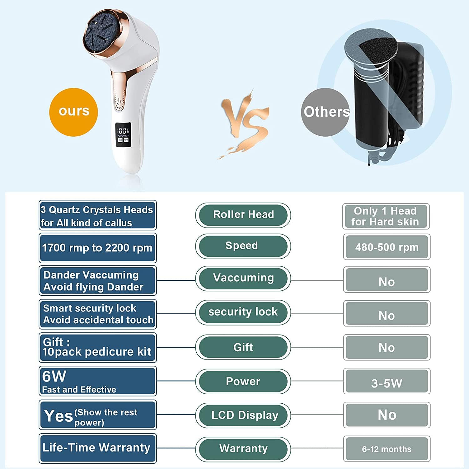 - Pedicure kit with 3 Grinding Head, 2 Speed, with VACUUM ABSORPTION----- 3 Quartz Crystals Removable Roller Heads and 2 Speed Correspond to the roughness required to remove the calluses on the feet. UPGRADE powerful callus remover with dander vacuum cleaner quickly sucks away foot scraps, cle.an and hygienic, and sucks while grinding. dust-free, and foot scraps will not be scattered in air or floor, an essential home pedicure kit for people who has cleanliness.