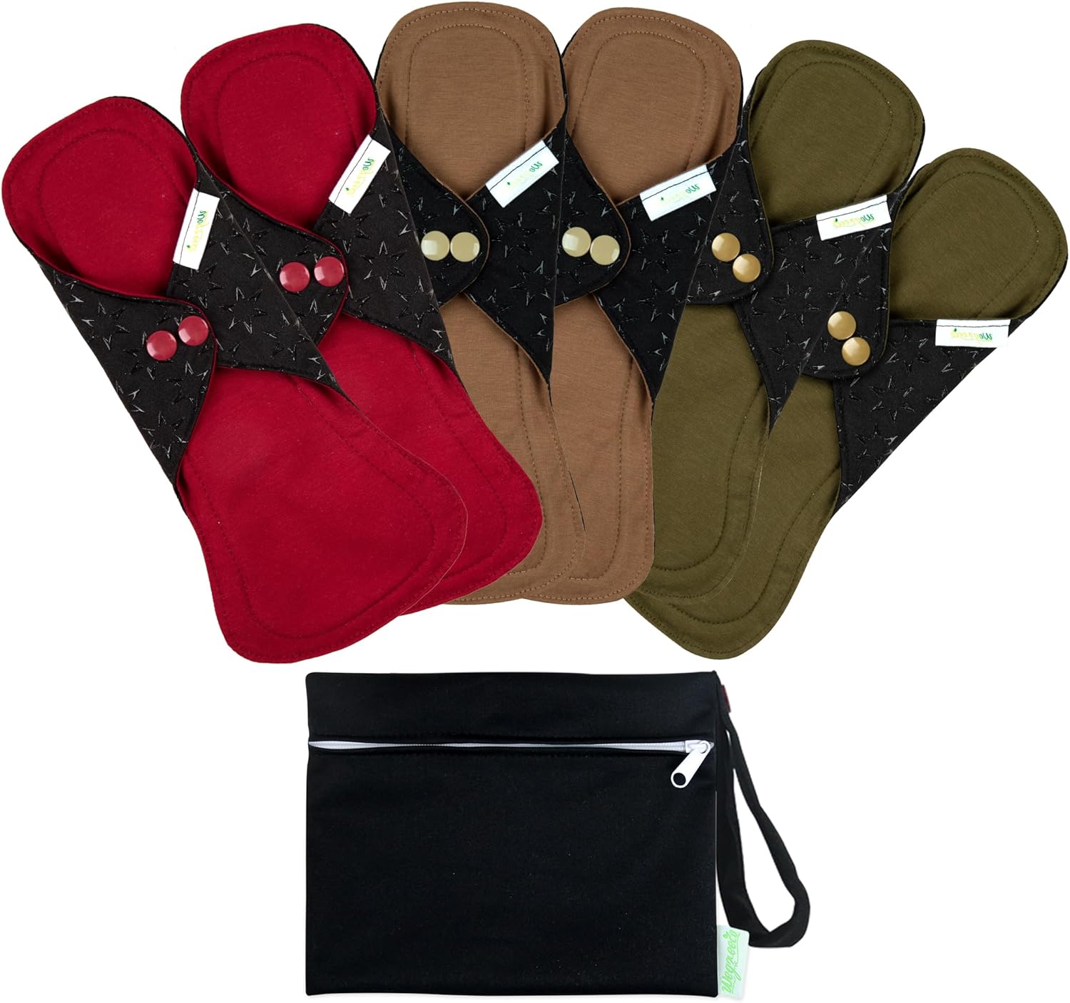 wegreeco 6 Pcs Reusable Menstrual Pads, Ultra Absorbent Cloth Pads for Heavy Flow, Sanitary for Teens, Women, Nonslip Panty Liners + Bag (Aqua, Burgundy, Coffee, S)