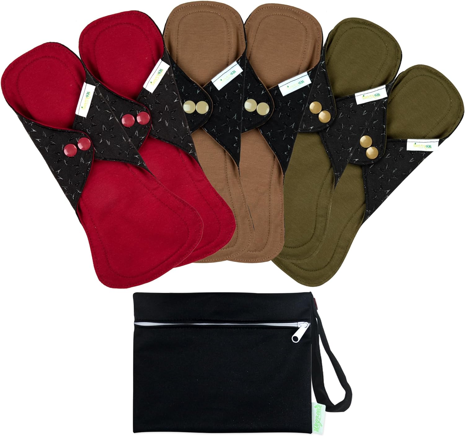 wegreeco 6 Pc Reusable Menstrual Pads, Ultra Absorbent Cloth Pads for Light/Heavy Flow, Sanitary for Teens, Women, Nonslip Panty Liners + Bag (Aqua, Burgundy, Coffee, XL)