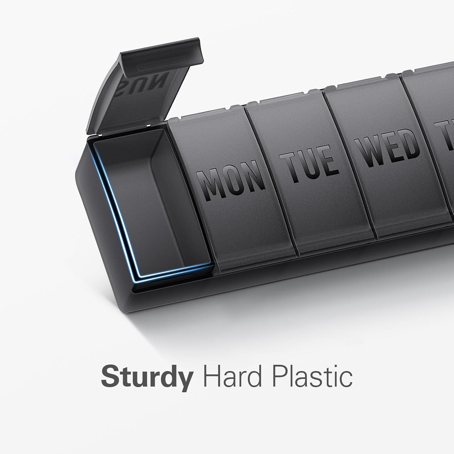 - Permanent Etched Day Labels: Adopting the new technology to makes the day of the week etched on the lids of the medicine pill organizer, the letters will keep clear and distinct eternally.