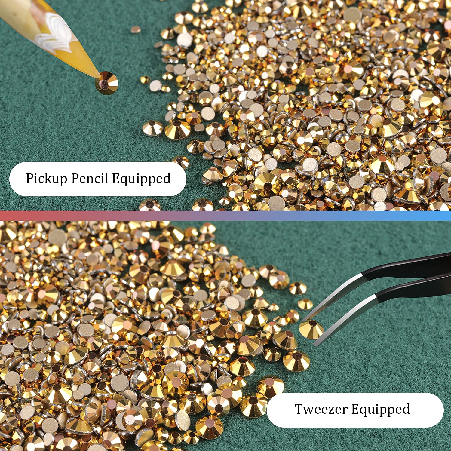 - ❤WHAT YOU WILL RECEIVE -- 1 Box of 6 Sizes Gold Round Glass Nail Crystal Rhinestones Beads (Totally About 1720 PCS); 1 PCS Rhinestone Picker Pencil; 1 PCS Tweezer. The Well Equipped Rhinestone Set Is Suitable for Both Professional Nail Technician and Inexperienced Starter for Nail Art.