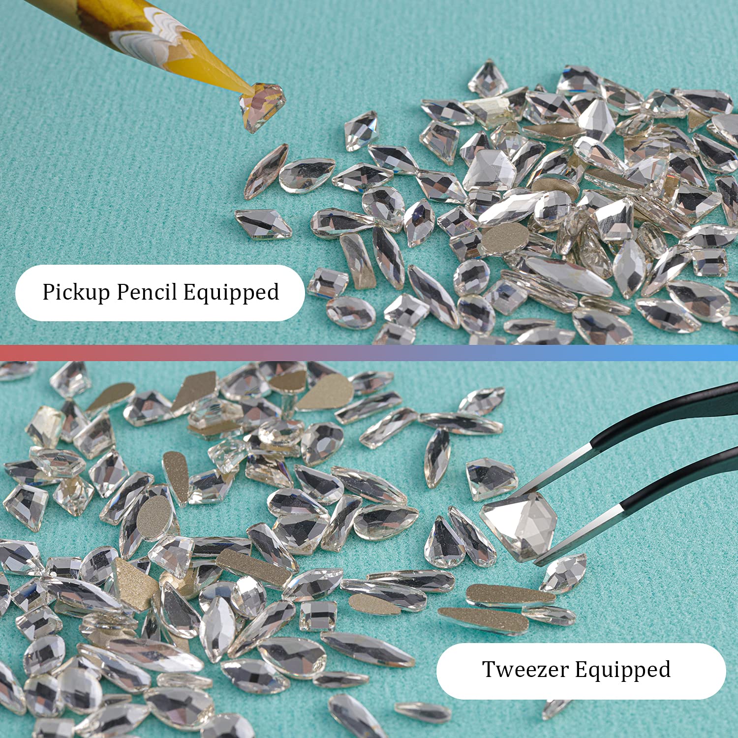 - ❤HELPFUL PICK-UP TOOLS -- The Tools Can Be Used for Multi-Function, including Round and Multi-shaped Crystals, or Flatback or Non-Flatback Crystals. After Applying Nail Polish, Just Simply Use the Equipped Tools ( Pickup Pencil + Tweezer ) to Pick Up the Crystals onto Your Nails to Create Your Fabulous DIY Designs! They Are Very Helpful in Picking Up Small Crystals. Just Make Sure You Make the Rhinestones Face up First Before You Start Working on Your Nails.