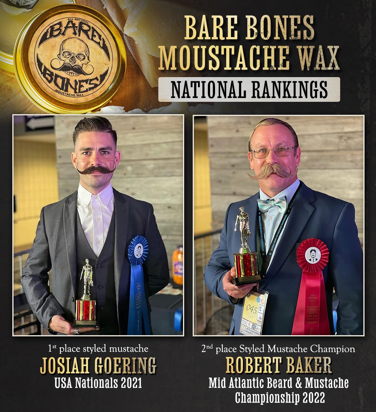 - Caution For Serious Mustaches Only - If you are a man looking to take his mustache game to the next level Bare Bones is the mustache wax for you.