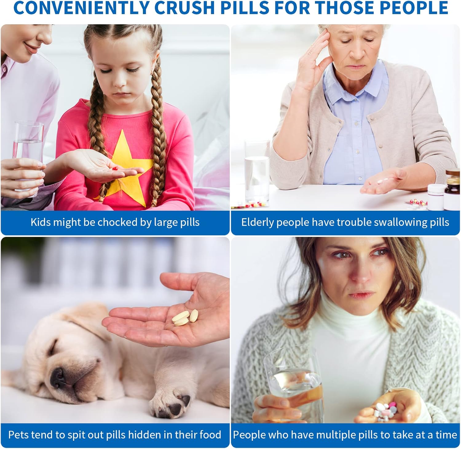 - 【NO MORE MANUAL GRINDING】Perfect for the elderly and those with arthritis or weak grip strength, our Electronic pill grinder features stainless steel blades to effectively grind pills in seconds. Simply place your large pills and tablets in the medicine crusher cup, replace the covers and press downward to grind them into one easy-to-manage dose.
