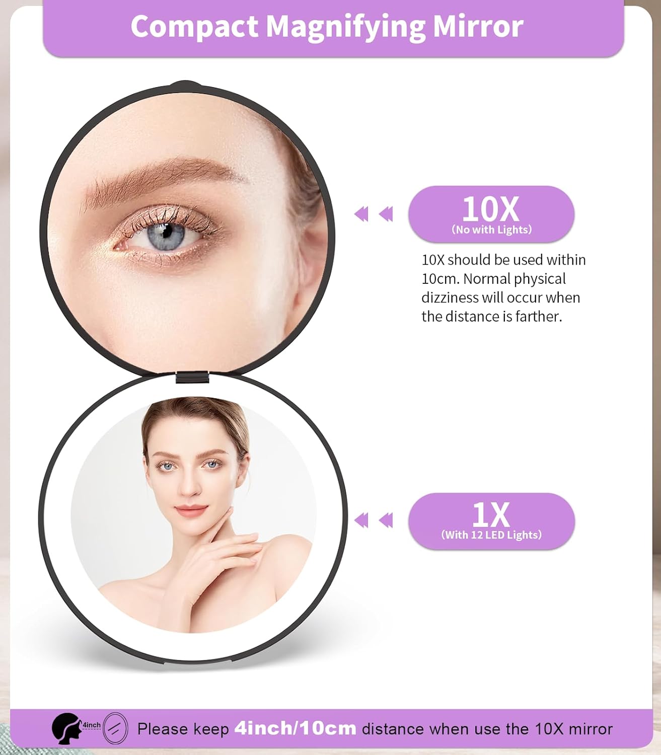 - 10x Magnifying:10x compact magnifying mirror, better magnification of facial details,which is good for makeup needs, shaving, or deep cleaning.Tip: When using the 10x magnifying mirror, please keep a distance of less than 10 cm, otherwise it may cause normal dizziness and affect imaging