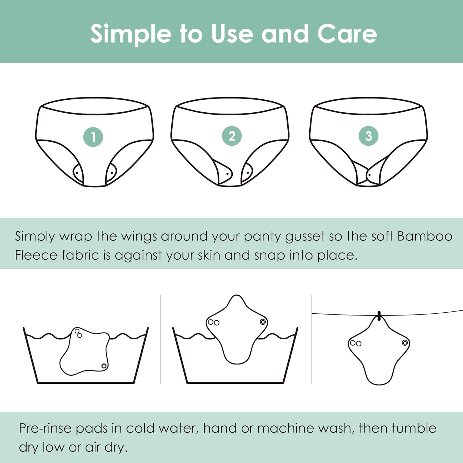 - Multi-Purpose Panty Liners: Our washable pads menstrual are ideal as period panties, postnatal maternity pads or washable light flow cloth urinary incontinence pads for teens, women and men. Great for travel, indoor and outdoor, exercise, or daily use. Washable pads menstrual coming with a leak-free PUL wet bag, the handle with snap is easy for you to carry or hang everywhere. Just use or wash, fold it, nobody will know what it is, no more embarrassing.