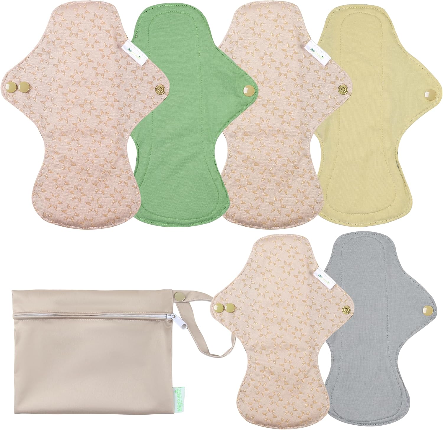 wegreeco 6 Pcs Reusable Menstrual Pads, Ultra Absorbent Cloth Pads for Heavy Flow, Sanitary for Teens, Women, Nonslip, Inner Mustard Yellow, Grey, Beige, Rose Gold Outer, M
