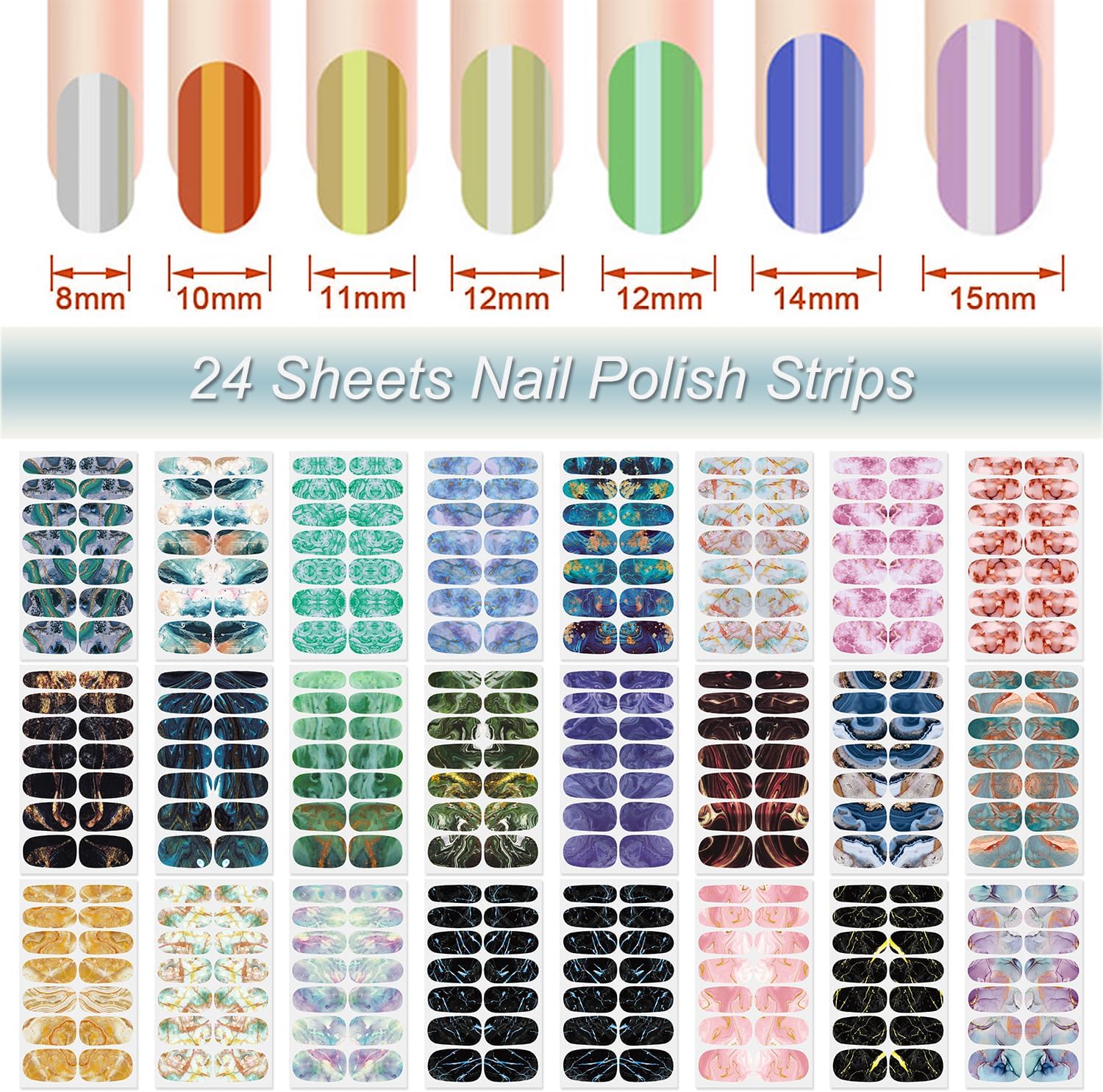 - [Package Included] -- 24 sheets nail polish strips for women + 1pc nail files + 1pc wood cuticle stick. each nail strips has 14 pieces nail tips and 7 sizes, suitable for most people's nail size.